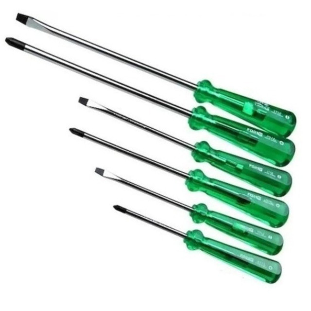 KIT JOGO CHAVES DE FENDA E PHILLIPS SIMPLES E CRUZADA 6 PEÇAS >>> COMPOSIÇÃO - Chave Fenda 1/8x3" - Chave Fenda 3/16x4" - Chave ponta Fenda 1/4x6" - Chave ponta Philips 1/4x5'' - Chave ponta Philips 3/16x4'' - Chave ponta Philips 1/8x3'' >>> BENEFÍCIOS DO JOGO - As hastes, as chaves de fenda e philips são testadas em máquinas de ensaio específicas, para verificar o perfeito balanço entre resistência mecânica e dureza - Cabos injetados com material de alta resistência - Os dimensionais das pontas são verificados com gabaritos padrão, calibrados e certificados - As ferramentas são produzidas e testadas conforme normas específicas >>> CHAVE DE FENDA - Sua ponta é chata e estreita, e serve como o encaixe perfeito para parafusos, para apertá-los ou afrouxá-los - Pode ser utilizada como cinzel em emergências e também ser utilizada algumas vezes em parafusos de cabeça Phillips - Essenciais na hora de montar ou desmontar móveis - Item importantíssimo em qualquer caixa de ferramentas, pois é necessária para qualquer tipo de reparo ou reformas >>> CHAVE PHILIPS - Tem a ponta fina, em formato de cone - São usadas para apertar ou afrouxar parafusos do tipo fenda cruzada, ou seja, os que tem o formato de “X” cavado - A ponta angular serve para que você encaixe a chave de fenda mais profundamente na cabeça do parafuso, sem que haja risco da lâmina deslizar para o lado - Hoje em dia, a maioria dos parafusos encontrados em móveis e eletrodomésticos apresentam fendas Phillips - Essencial para trabalhos domésticos e, assim como a chave de fenda, não pode faltar na sua caixa de ferramentas >>> INFORMAÇÕES IMPORTANTES :: TODOS OS PRODUTOS ACOMPANHAM NOTA FISCAL :: PRODUTO ORIGINAL LOTUS :: DISPONÍVEL EM ESTOQUE :: PRODUTO NOVO, NA EMBALAGEM DO FABRICANTE :: IMAGEM DO ANÚNCIO É A REAL DA PEÇA :: TODA MERCADORIA VENDIDA É CONFERIDA NO ATO DO ENVIO ---------- SOLDAFER FERRAMENTAS -----------LOJAS NO ESPÍRITO SANTO