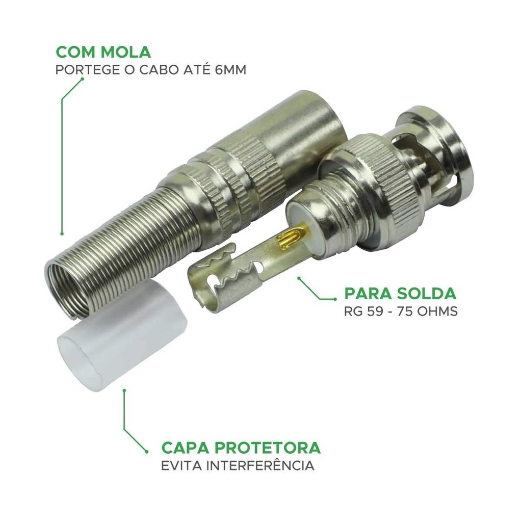 Kit Jogo Conector BNC 75 OHMS RG-59 6mm Para Solda Com Mola 10 Unidades