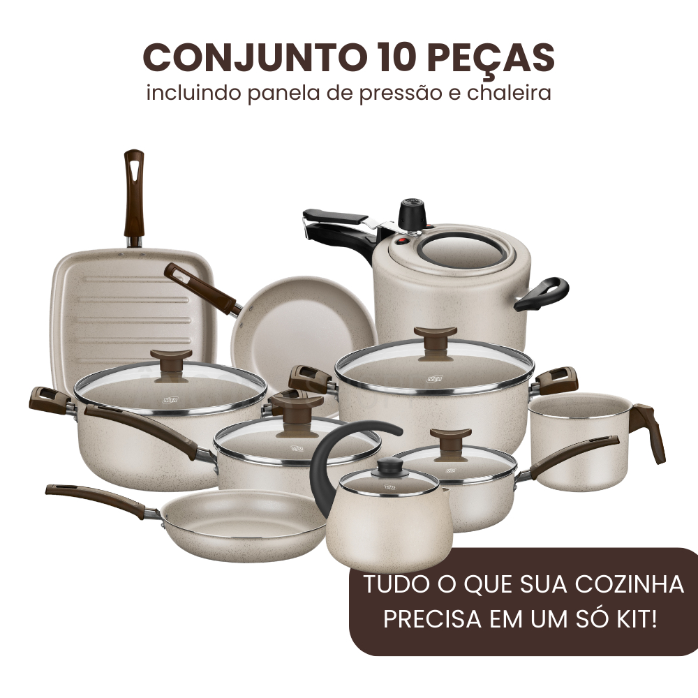 Renove sua cozinha com o Kit Jogo de 10 Peças MTA Aura na cor Baunilha, um conjunto completo, versátil e ideal para o dia a dia. Este kit foi pensado para quem busca praticidade, beleza e verdadeiro custo-benefício no preparo das refeições. Diferencial importante: são 10 peças reais, 100% panelas e itens de preparo. Ou seja, não há inclusão de utensílios extras (como colheres, espátulas ou acessórios) apenas para “aumentar” a quantidade de peças e parecer mais vantajoso. Aqui, você leva um conjunto realmente completo, com peças úteis para uso diário. Com visual elegante na cor baunilha, o conjunto combina funcionalidade e sofisticação, deixando sua cozinha mais bonita e organizada. Conteúdo do Kit (10 peças) 01 Fervedor (Leiteira) 01 Chaleira 2L 01 Frigideira Francesa N18 – 0,7L 01 Frigideira Alta N20 – 1,1L 01 Frigideira Quadrada Grill (Bistequeira) – 1,1L 01 Panela com Tampa de Vidro N16 – 1,4L 01 Panela com Tampa de Vidro N18 – 1,8L 01 Caçarola com Tampa de Vidro N18 – 1,8L 01 Caçarola com Tampa de Vidro N20 – 2,4L 01 Panela de Pressão com Visor – 4,5L Diferenciais do conjunto Kit completo para diversas receitas do dia a dia Inclui panela de pressão com visor para maior praticidade no preparo Contém frigideiras de diferentes formatos (tradicional, alta e grill) Chaleira 2L e fervedor/leiteira para uso diário Panelas e caçarolas com tampa de vidro Design moderno e elegante na cor Baunilha Indicação de uso Perfeito para preparar: arroz, feijão, massas e molhos carnes e grelhados frituras e refogados leite, café e chá refeições completas para toda a família