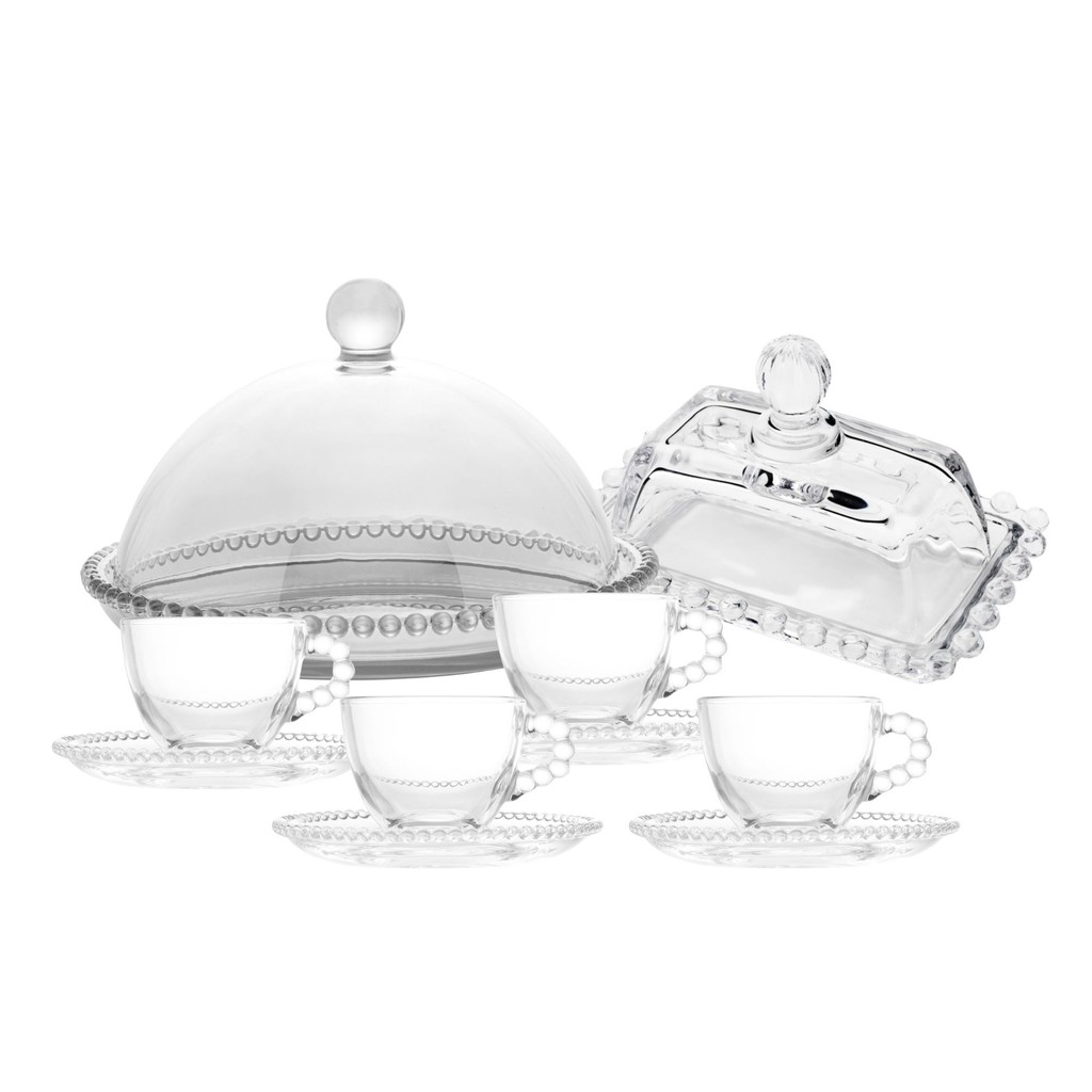Kit Jogo de 4 Xícaras de Café, Queijeira com Tampa e Manteigueira de Cristal Pearl Wolff
