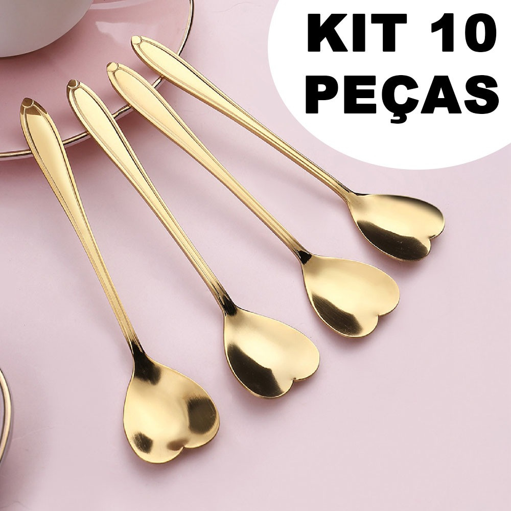 Kit Jogo De 5 ou 10 Colher Coração Dourada Café Sobremesa Chá 10 Pçs Mesa Posta Amor