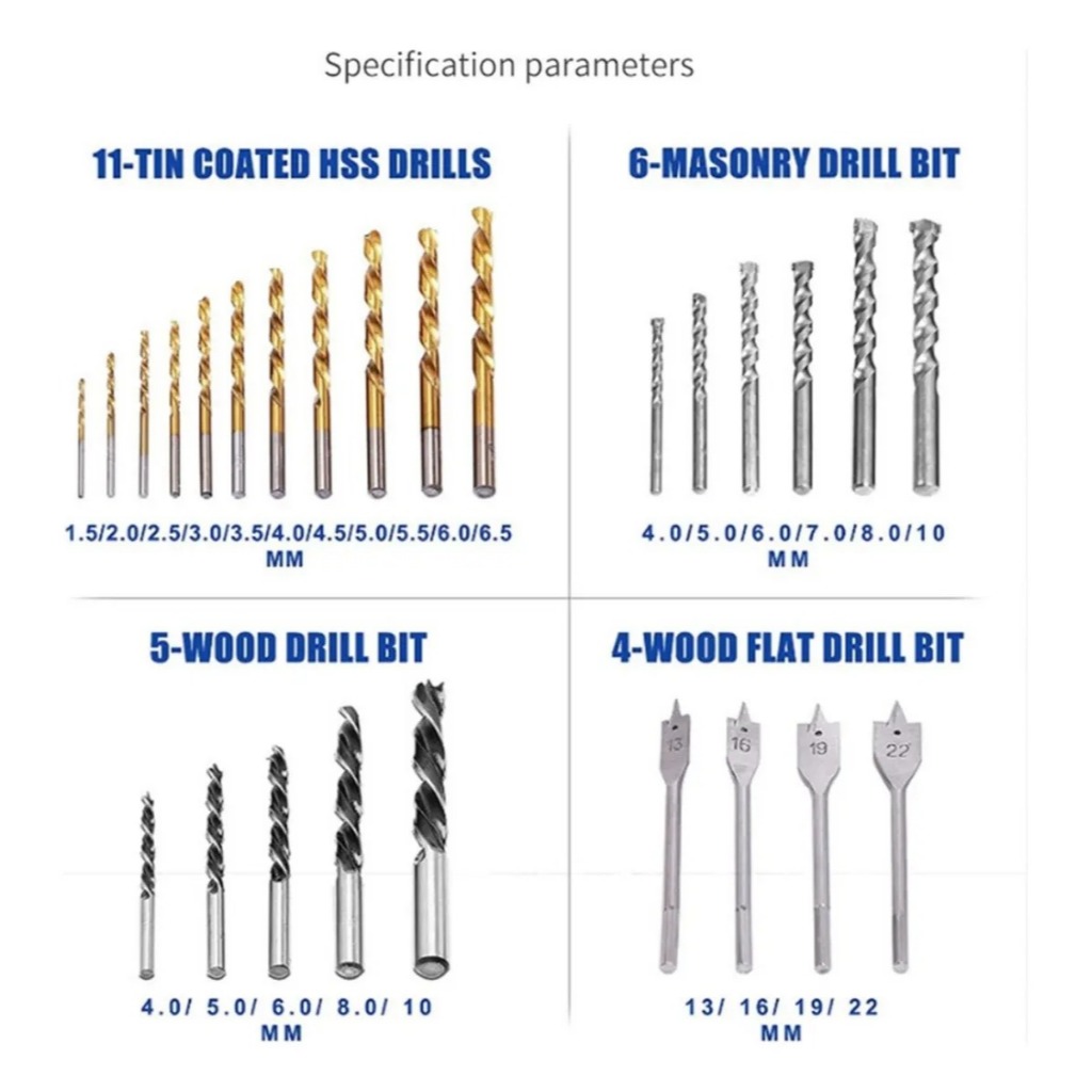 Kit completo de brocas e bits, ideal para profissionais e bricolagem. Conjunto pensado para uso em furadeiras e parafusadeiras, oferecendo versatilidade para trabalhos em madeira, alvenaria e metal. Todas as pontas e brocas são fabricadas em aço inox de alta resistência garantindo durabilidade e bom acabamento nos serviços do dia a dia. Acompanha maleta resistente para armazenamento e transporte. Principais benefícios: Versatilidade: conjunto adequado para perfuração, parafusamento e cortes com serra copo. Organização: maleta prática com compartimentos para guardar todas as peças. Durabilidade: brocas HSS e pontas em aço inox de qualidade. Pronto para uso: compatível com furadeiras e parafusadeiras convencionais. Aplicações: Reparos e manutenção residencial e profissional. Perfuração em madeira, concreto/alvenaria e metais. Parafusamento em móveis, esquadrias, instalações elétricas e montagem em geral. Informações técnicas: Material: Aço inox / Brocas HSS. Uso: parafuradeiras e furadeiras convencionais. Conteúdo organizado em maleta para transporte. Itens inclusos (lista detalhada): 11x Brocas HSS: 1.5 / 2.0 / 2.5 / 3.0 / 3.5 / 4.0 / 4.5 / 5.0 / 5.5 / 6.0 / 6.5 mm 5x Brocas para madeira: 4.0 / 5.0 / 6.0 / 8.0 / 10.0 mm 6x Brocas para alvenaria: 4.0 / 5.0 / 6.0 / 7.0 / 8.0 / 10.0 mm 4x Brocas chatas para madeira: 13 / 16 / 19 / 22 mm 50x Pontas bits (25 mm), distribuídas em: 12x Pontas Fenda: 2x SL3 / 2x SL4 / 2x SL5 / 2x SL6 / 2x SL6.5 / 2x SL7 8x Pontas Torx: T10 / T15 / T20 / T25 / T27 / T30 / T35 / T40 8x Pontas Phillips: 2x PH0 / 2x PH1 / 2x PH2 / 2x PH3 8x Pontas Pozidriv: 2x PZ0 / 2x PZ1 / 2x PZ2 / 2x PZ3 14x Pontas Hexagonais: 2x H1.5 / 2x H2 / 2x H2.5 / 2x H3 / 2x H4 / 2x H5 / 2x H6 9x Pontas bits (50 mm), distribuídas em: 3x Pontas fenda: SL4 / SL5 / SL6 3x Pontas Phillips: PH1 / PH2 / PH3 3x Pontas Pozidriv: PZ1 / PZ2 / PZ3 5x Soquetes: 6.0 / 7.0 / 8.0 / 9.0 / 10.0 mm 1x Gabarito para medição 1x Serra copo 1x Maleta para transporte e armazenamento Observações: Produto destinado a uso em furadeiras e parafusadeiras. Seguir boas práticas de uso e segurança do equipamento. Adicione ao carrinho e garanta um kit completo e organizado para suas tarefas de perfuração e parafusamento.