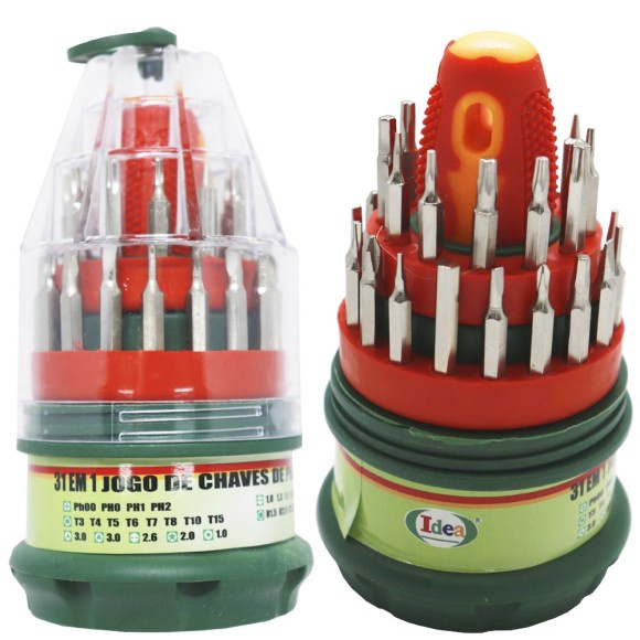 COMERCIAL VIPASA DISTRIBUIDORA. É um prático e versátil kit com 31 pontas de chaves diversas, como fenda, philips, torx além de um prático estojo. Kit de chaves para manutenção e montagem de celulares e eletrônicos, evita que na manutenção danifique o seu equipamento com ferramentas inadequadas. Fotos ilustrativas Chaves de Fenda tamanho: 1.5 - 2.0 - 2.5 - 3.0 - 3.5 Chaves Alen tamanho: H1.3 - H1.5 - H2.0 - H2.5 - H3.0 - H4.0 Chaves Torx tamanho: T3 - T4 - T5 - T6 - T7 - T8 - T9 - T10 - T15 - T20 Chaves Phillips tamanho: 3.0 - 3.5 - 1.7 - 2.0 - 2.5 Chave Estrela tamanho: 2.0 Chave Triângulo tamanho: 3.0 Chave "Y" tamanho: Y3.0 Chave "U" tamanho: U2.6 Cabo Emborrachado: 1 COMERCIAL VIPASA DISTRIBUIDORA.