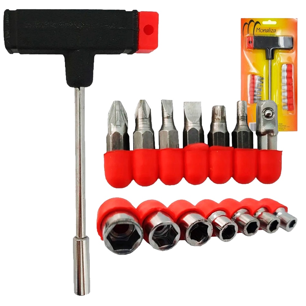COMERCIAL VIPASA DISTRIBUIDORA Kit Jogo De Chaves T Com Pontas Bits Manual 15 Peças Prático Multiuso Geral Descrição Do Produto CHAVE T JOGO 15 PEÇAS SOQUETE + BITS 1131 - Kit chave “T” com cabo ergonômico torna o uso mais confortável. - Material: Aço carbono e plástico PVC - Marca: Monaliza - Referência Fabricante: 1131 - Origem: China - Conteúdo: 1 Chave T com 14 pontas Ref. 1131/ 1135U * 1 - chave “T” com cabo em plástico * 7 - bits * 7 - Soquetes Observações: * Medidas aproximadas da chave 16cmx 8,5cm * Utilize equipamentos de proteção individual (óculos, luvas, etc..) * Manter fora do alcance das crianças * Imagens meramente ilustrativas COMERCIAL VIPASA DISTRIBUIDORA