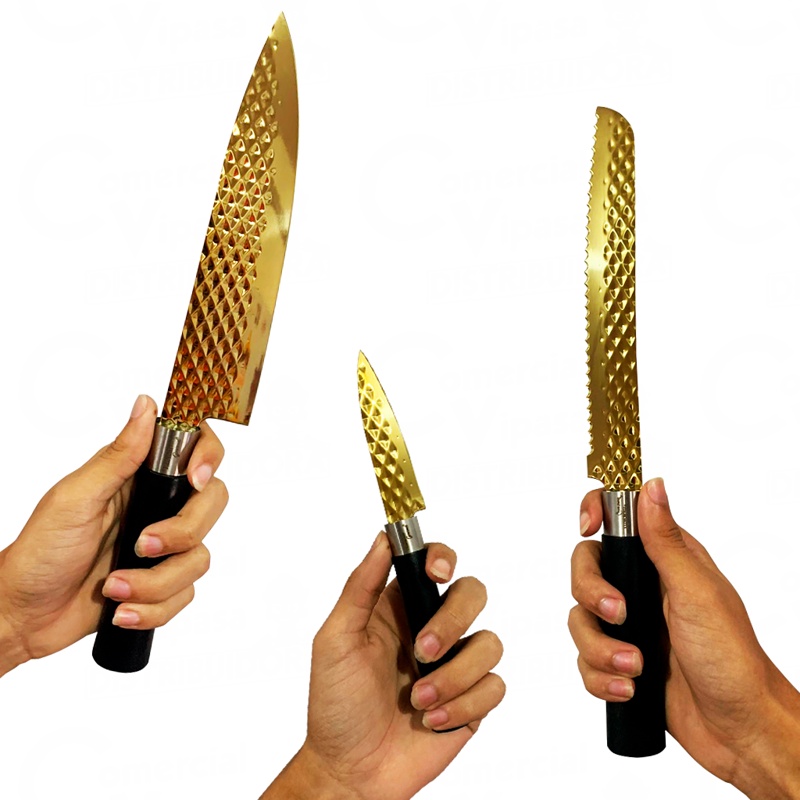 COMERCIAL VIPASA DISTRIBUIDORA. Kit Jogo De Facas Deluxe Gourmet De 4 Peças Aço Inox Alto Brilho Resistente Elegance Alta Qualidade Jogo de Facas Deluxe Dourado 4 Peças 06892 Titanium – Sofisticação e Precisão na Sua Cozinha! O Jogo de Facas Deluxe Dourado 4 Peças 06892 da Titanium combina elegância, resistência e alto desempenho para proporcionar uma experiência única na cozinha. Com um design sofisticado em acabamento dourado, essas facas são perfeitas para quem busca beleza e funcionalidade no preparo de alimentos. Com lâminas afiadas em aço inox de alta qualidade e cabos ergonômicos para melhor manuseio, esse conjunto oferece precisão no corte e durabilidade superior, tornando-se indispensável para o dia a dia ou para compor uma cozinha refinada. 🔹 Benefícios do Jogo de Facas Deluxe Titanium: ✔ Design Exclusivo e Sofisticado: Acabamento dourado para uma cozinha mais elegante. ✔ Lâminas em Aço Inox: Alta resistência à corrosão e cortes precisos. ✔ Cabos Ergonômicos: Maior conforto e segurança no manuseio. ✔ Facas Versáteis: Diferentes modelos para atender diversas necessidades no preparo dos alimentos. ✔ Fácil de Limpar: Superfície lisa que facilita a higienização. ✔ Durabilidade Garantida: Material de alta qualidade para longa vida útil. 📋 Especificações Técnicas: 📌 Marca: Titanium 📌 Modelo: Deluxe 06892 📌 Material das Lâminas: Aço Inox 📌 Material dos Cabos: Polipropileno resistente com design anatômico 📌 Acabamento: Dourado Luxuoso 📌 Quantidade de Peças: 4 📌 Uso: Cozinha doméstica e profissional 🛠️ O Jogo Inclui: ✔ 1 Faca Chef: Ideal para cortes precisos de carnes, legumes e frutas. ✔ 1 Faca Santoku: Perfeita para fatiar, picar e processar alimentos com facilidade. ✔ 1 Faca para Pão: Lâmina serrilhada para cortar pães sem amassar. ✔ 1 Faca Multiuso: Para cortes do dia a dia, desde carnes até vegetais. 🎯 Como Cuidar das Suas Facas Deluxe Dourado? ✅ Lave à mão com detergente neutro e esponja macia para preservar o acabamento dourado. ✅ Seque imediatamente após a lavagem para evitar manchas. ✅ Armazene corretamente em suportes ou gavetas protegidas para evitar danos à lâmina. ✅ Evite cortar superfícies duras como vidro, mármore ou metais para manter o fio afiado. 📦 O que você recebe? ✔ 1 Jogo de Facas Deluxe Dourado com 4 Peças (Modelo 06892) ✔ Embalagem elegante, ideal para presente 🎁 jogo de facas inox dourado, facas de cozinha luxo, faca chef dourada, jogo de facas premium, kit de facas inox, jogo de facas titanium, faca santoku dourada, jogo de facas elegante, facas resistentes inox, jogo de facas para cozinha. ✅ Jogo de Facas Deluxe Dourado 4 Peças – Elegância e Precisão na Cozinha! ✅ Kit de Facas Inox Dourado 4 Peças – Design Sofisticado e Afiado! ✅ Jogo de Facas Premium 4 Peças – Luxo e Funcionalidade na Sua Cozinha ✅ Facas de Cozinha Inox Dourado – Kit Completo com 4 Peças ✅ Jogo de Facas Titanium Deluxe – Beleza, Resistência e Alta Qualidade! 💡 Adicione sofisticação à sua cozinha com o Jogo de Facas Deluxe Dourado 4 Peças Titanium! Garanta já o seu! 🍽️✨ COMERCIAL VIPASA DISTRIBUIDORA.