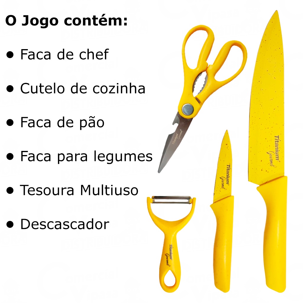 Kit Jogo De Facas Faqueiro Gourmet De 6 Peças Aço Inox Amarelo Profissional Cozinha Churrasco