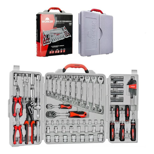 Kit Jogo De Ferramentas Maleta Com 110 Peças Soquete Chave Completo Worker Cinza Aço Cromo Vanádio