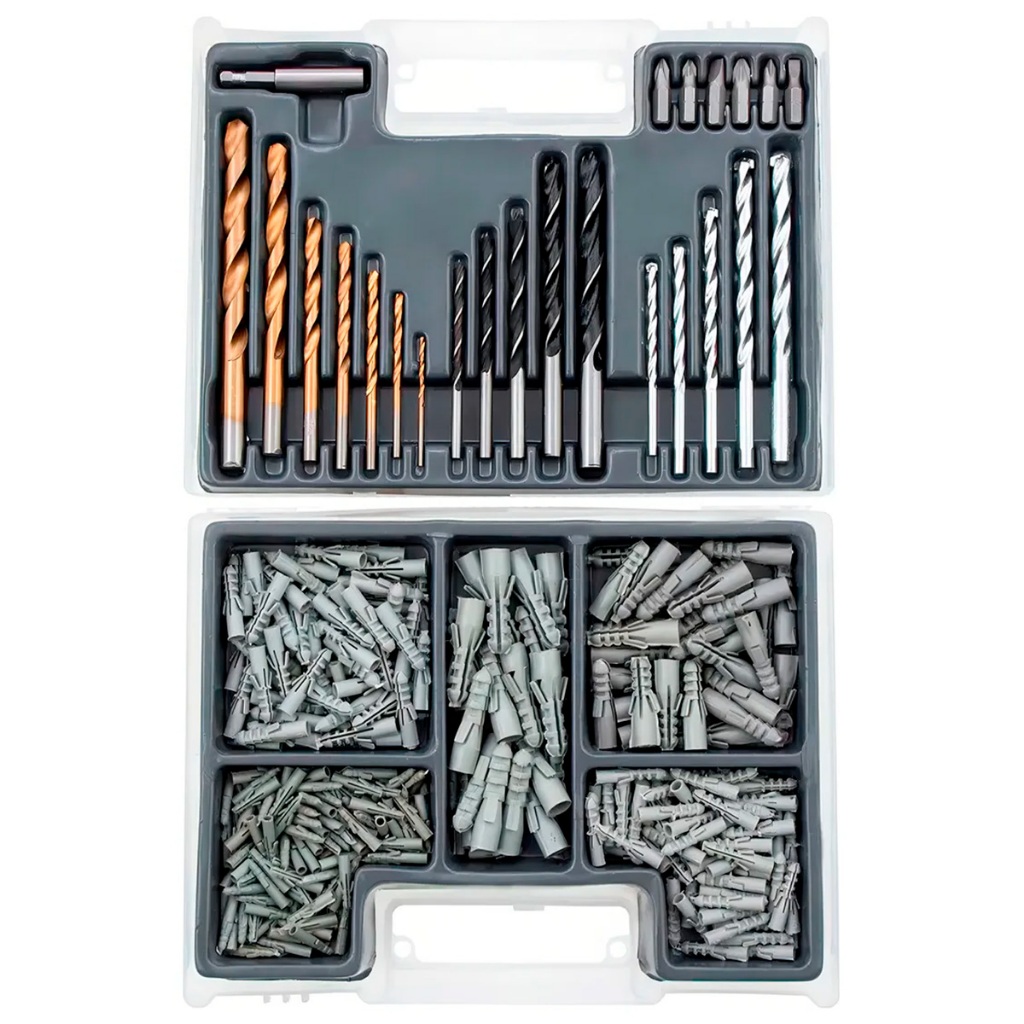 Distribuído por Ismafer Ferramentas JOGO DE BROCAS BITS E BUCHAS COM 300 PEÇAS MTX COM MALETA O Jogo de brocas bits e buchas com 300 peças da MTX é ideal para uso doméstico e hobby, conta com as brocas e bits e buchas nas medidas mais comuns do mercado. As Broca de concreto são feita de aço carbono com uma placa de metal duro feita de material VK8, brocas para metal de aço rápido (HSS), brocas para madeira são de aço-carbono. Bits de aço cromo vanádio, instrumentos embalados em caixa de plástico. COMPÕEM O KIT: 02 - Bits fenda 65 - Buchas 5mm 50 - Buchas 6mm 25 - Buchas 8mm 16 - Buchas 10m 01 - Prolongador 120 - Buchas 4mm 04 - Bits phillips 05 - Bocas para concreto: 4, 5, 6, 8 e 10mm 05 - Brocas para madeira: 4, 5, 6, 8 e 10mm 07 - Brocas para metal: 2, 3, 4, 5, 6, 8 e 10mm. Marca: MTX Modelo: 725779 Garantia: Até 3 meses pelo fabricante. SKU: 12375 Distribuído por Ismafer Ferramentas