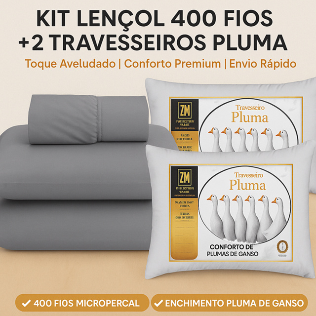 Kit Jogo de Lençol Casal 400 Fios com Elástico + 2 Travesseiros Pluma de Ganso