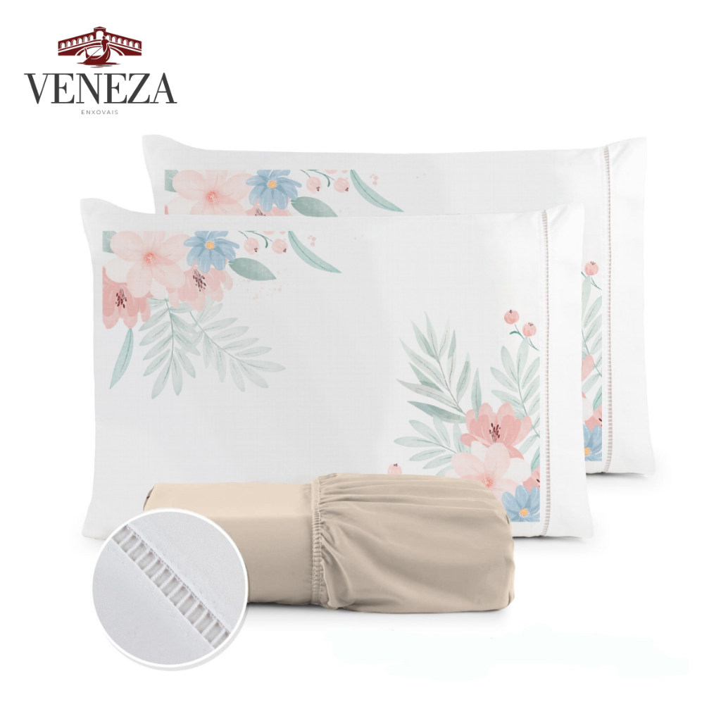Bem Vindos à Veneza Enxovais amigos e clientes... Nosso produto possui um toque acetinado que traz além da maciez um toque a mais de sofisticação para o seu quarto. O lençol possui elástico em toda volta e as fronhas estampadas um lindo acabamento em PONTO PALITO! SOLTEIRO 02 PEÇAS, sendo 01 Lençol com elástico medindo 1,88 x 0,88 x 25cm de altura. 01 fronha estampada com medida: 70cm x 50cm (acabamento em ponto palito). CASAL PADRÃO 03 PEÇAS, sendo: 01 Lençol com elástico medindo 1,88m x 1,38m x 25cm de altura. 02 fronhas estampadas com medidas: 70cm x 50cm (acabamento em ponto palito) CASAL QUEEN 03 PEÇAS, sendo: 01 Lençol com elástico medindo 1,98m x 1,58 x 30cm de altura. 02 fronhas estampadas: 70cm x 50cm (acabamento em ponto palito). CASAL KING 03 PEÇAS, sendo: 01 Lençol com elástico medindo: 2,03m x 1,93m x 30cm de altura. 02 fronhas estampadas com medidas: 70cm x 50cm (acabamento em ponto palito). A fabricação é PROPRIA visando sempre qualidade e satisfação do cliente. Composição: Percal 400 fios acetinado Tecido: 100% Poliéster de excelente qualidade. Estaremos sempre a disposição para maiores informações por meio do campo de perguntas! Aguardamos sua compra! Obrigada. Observação: Lotes diferentes de tecidos podem apresentar variações de tonalidades mais escuras ou mais claras.