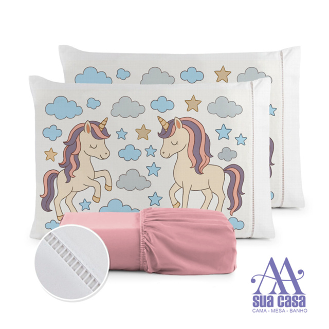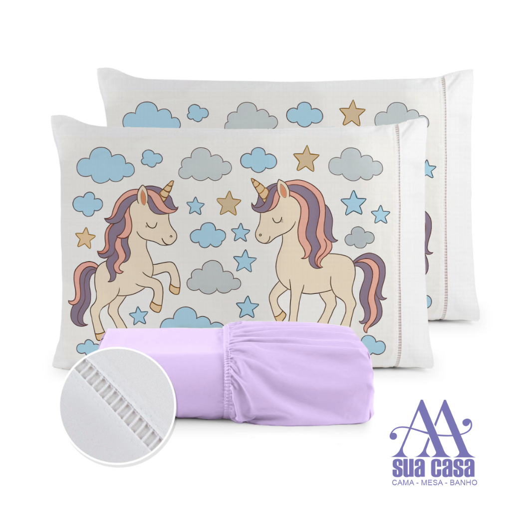 Kit Jogo de Lençol Micropercal 400 Fios Ponto Palito Fronha Unicórnio