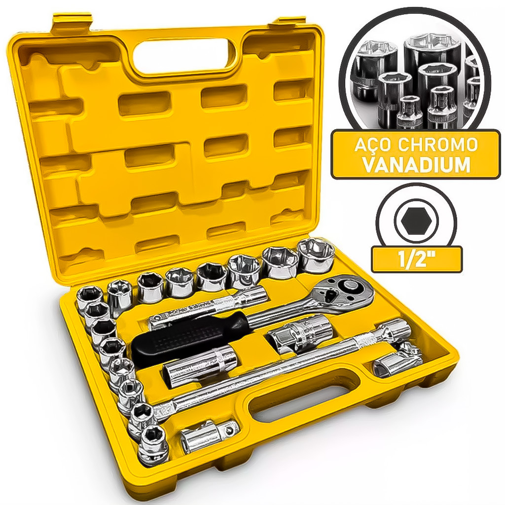 Kit Jogo De Soquete Sextavado 10 A 32mm 1/2Pol. Cromo Vanádio Aço Cr-V 22 Peças Profissional Cromado