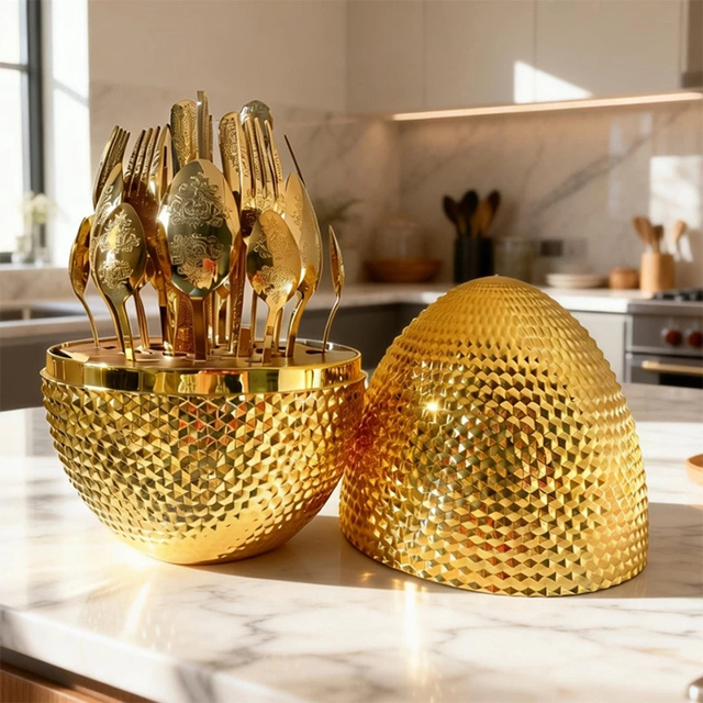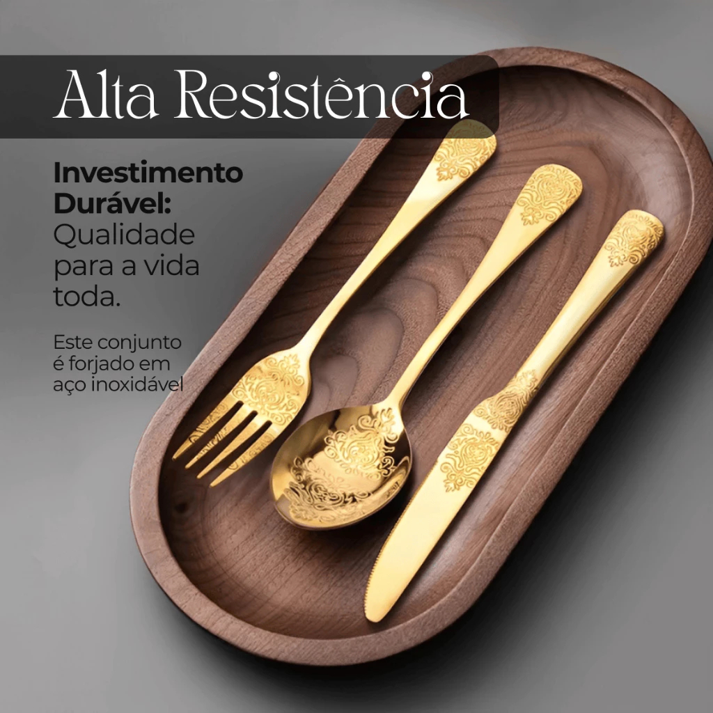 Kit Jogo De Talheres Em Aço 410 Inoxidável 24 peças, Dourado Faqueiro, Super Resistente, Formato Ovo de Ouro