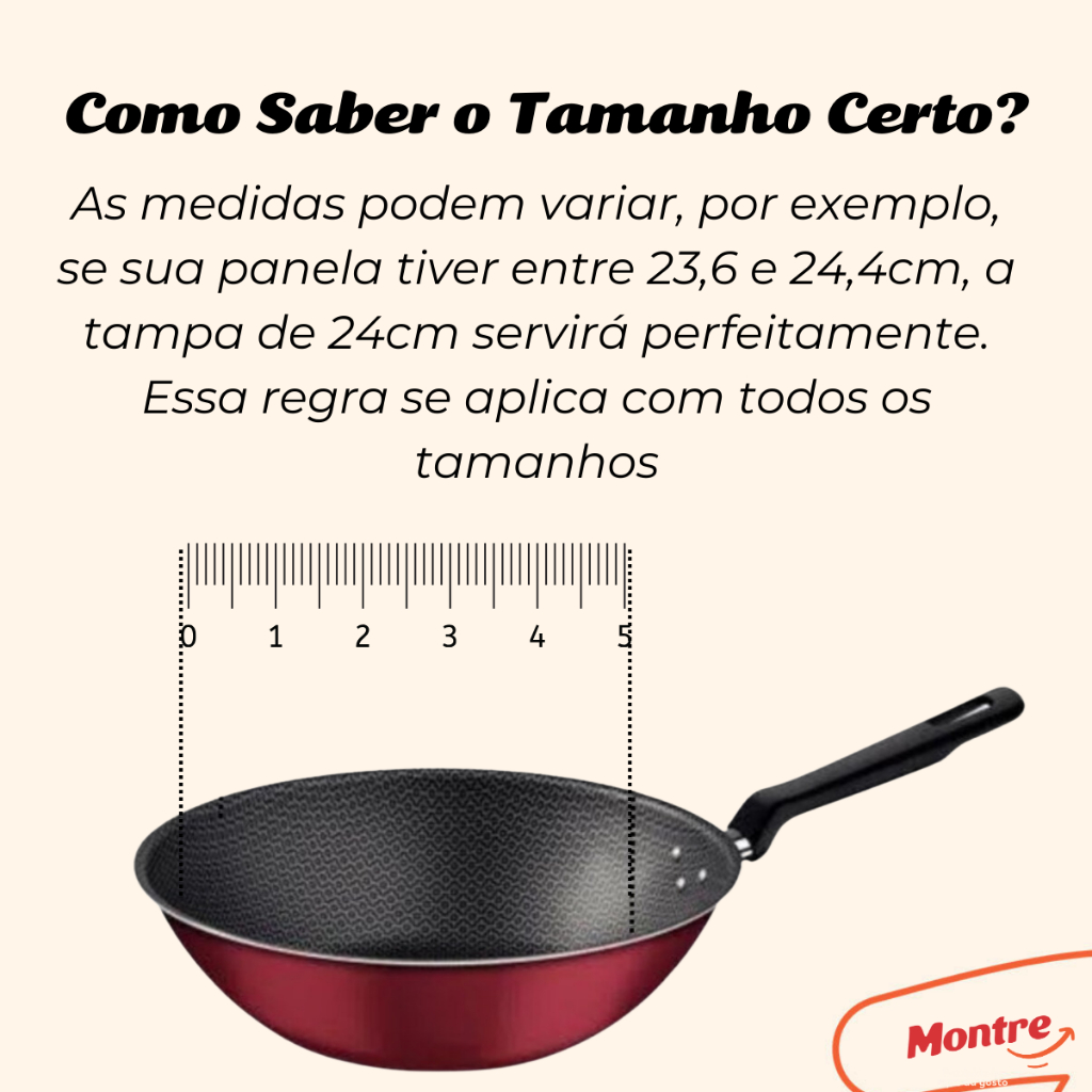 ampas de Vidro Montre com Puxador de Baquelite e Bordas de Inox - Escolha Seu Kit ou Peças Avulsas As Tampas de Vidro Montre são a solução perfeita para suas panelas, frigideiras, caçarolas, fervedores e outros utensílios de cozinha. Fabricadas com vidro temperado resistente, possuem bordas de aço inox que garantem um ajuste seguro e durabilidade, enquanto o puxador de baquelite oferece conforto e segurança ao manusear. Por que escolher nossas tampas? • Vidro Temperado: Resistência e visibilidade durante o preparo dos alimentos. • Bordas em Aço Inox: Acabamento moderno e maior durabilidade. • Puxador de Baquelite Antitérmico: Segurança e conforto ao manusear. • Versatilidade: Compatíveis com panelas, frigideiras, caçarolas, fervedores e mais. • Opções Personalizadas: Escolha o kit ideal para sua necessidade ou adquira as peças avulsas. Como escolher o tamanho ideal? Para garantir o ajuste perfeito, meça o diâmetro interno da boca da sua panela, considerando apenas a parte interna (de borda a borda). Confira abaixo: Tamanho da Tampa (cm) Serve em Utensílios com Boca (cm) 10 cm 9 a 10 cm 12 cm 11 a 12 cm 14 cm 13 a 14 cm 16 cm 15 a 16 cm 18 cm 17 a 18 cm 20 cm 19 a 20 cm 22 cm 21 a 22 cm 24 cm 23 a 24 cm 26 cm 25 a 26 cm 28 cm 27 a 28 cm 30 cm 29 a 30 cm 32 cm 31 a 32 cm 34 cm 33 a 34 cm 36 cm 35 a 36 cm 38 cm 37 a 38 cm 40 cm 39 a 40 cm Vantagens dos nossos kits e opções avulsas • Kits Completos: Monte seu conjunto com os tamanhos que melhor atendem sua cozinha. • Venda Avulsa: Ideal para reposições ou para aquela panela específica. • Praticidade: Tenha a tampa certa para cada tipo de preparo! Adicione já ao seu carrinho e escolha o kit perfeito ou a peça avulsa que faltava para sua cozinha ficar completa. Compre agora e transforme sua experiência na cozinha!