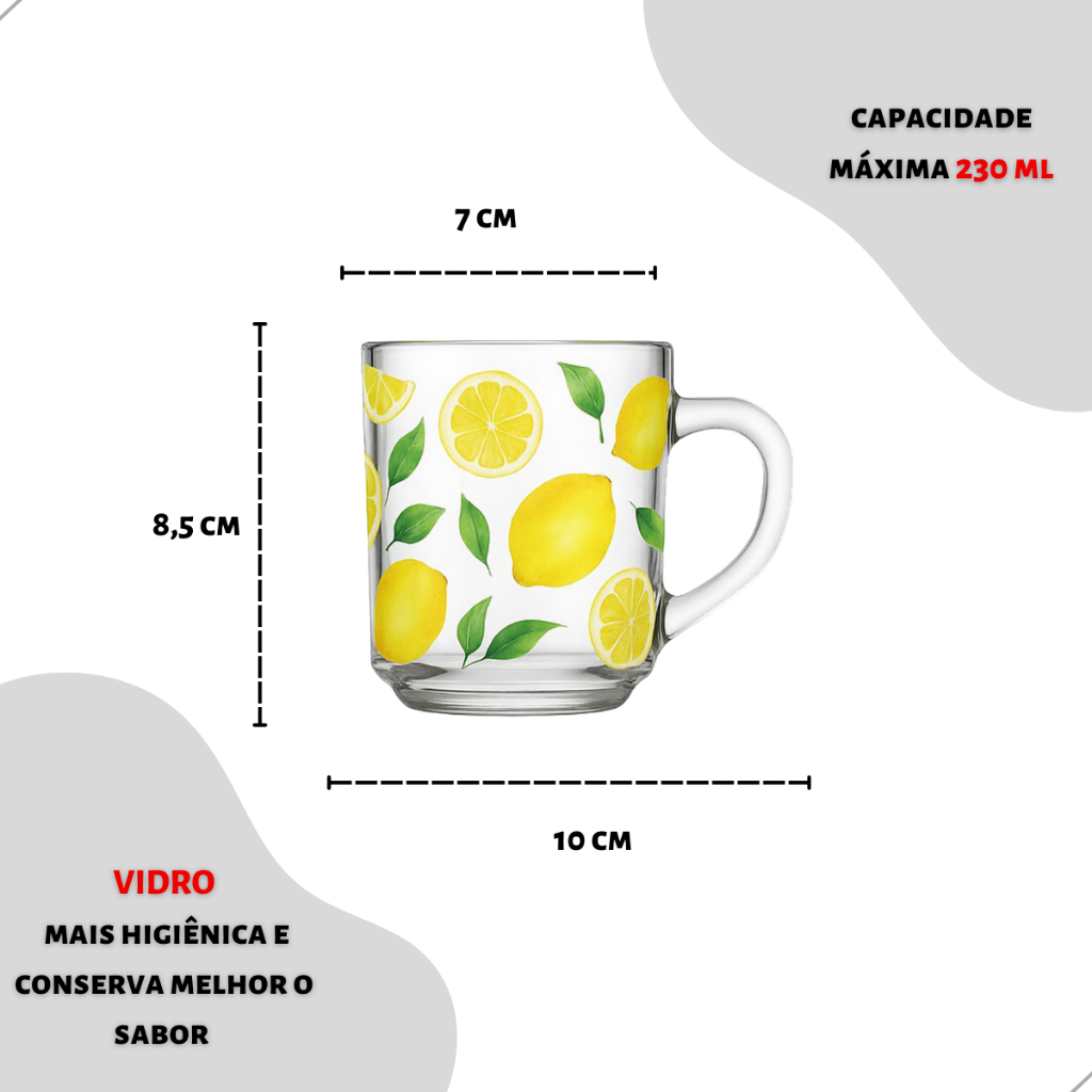 | Kit Jogo De Xicara Caneca De 230ml De Vidro Decorado Limão Siciliano este produto | R$ 32,99 | 38% | 5.0/5 | 7 |
