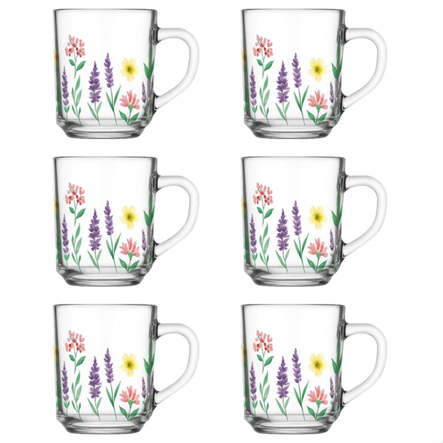 Kit Jogo De Xicara De Vidro De 230ml Decorado Jardim Flores Florida Lavanda Flor