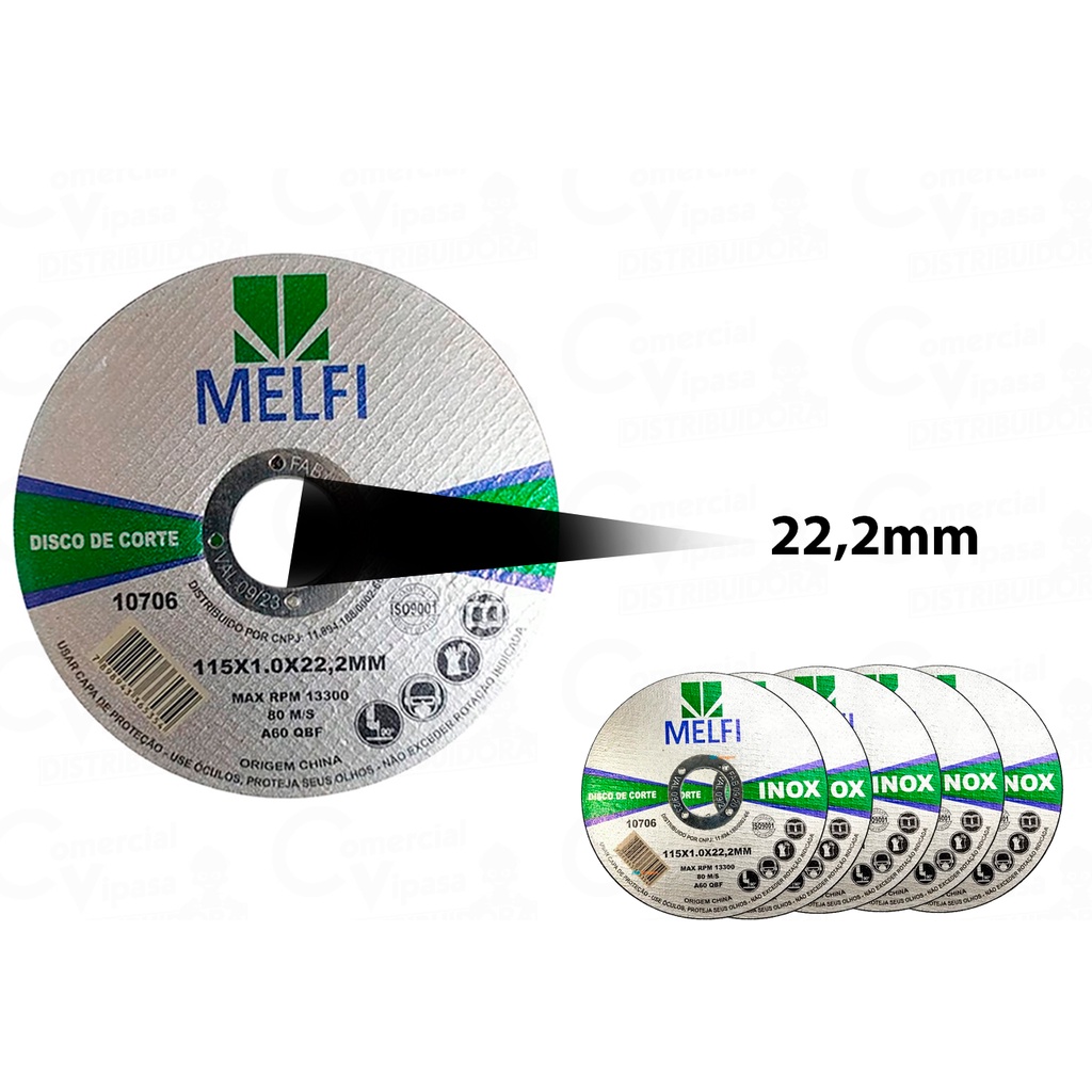 Comercial Vipasa Distribuidora :: Contém 50 Peças! O disco de corte da Melfi é fabricado dentro dos padrões mais rigoroso de qualidade atendendo as exigências da ISO 9000. São submetidos a testes rigorosos no laboratório metalúrgico para colocar no mercado um produto de qualidade e seguro para o usuário. - Diâmetro do disco de corte : 115,0mm ou 4 1/2" - Espessura do disco de corte: 1,0 mm ou 1/128" - Diâmetro do furo do disco de corte: 22,22 mm ou 7/8" - Velocidade de Trabalho máxima permitida do disco de corte extra fino para esmerilhadeira e de 13300 RPM ou 80m/s - O disco de corte extra fino para esmerilhadeira é recomendado para corte de chapas e perfis até 1,2 mm - Material do corpo do disco de corte extra fino para esmerilhadeira : Óxido de alumínio reforçado com duas malhas de fibra de vidro. - O disco de corte extra fino tem um anel metálico para proteção do furo no encaixe do eixo da esmeriladeira O disco de corte extra fino é utilizado juntamente com esmeriladeiras nos trabalhos de corte em aços carbonos, ferro fundido e aços inoxidável, proporcionando um excelente diminuição de rebarbas nas operações de corte, devido a sua espessura mais fina que os discos de corte normais. Vantagens e benefícios para você: - Maior Segurança - Fácil de usar - Maior Precisão - Economia de tempo - Corpo reforçado com malha de fibra de vidro - Anel interno de aço especial - Rende até 80% mais que o disco de corte convencional 4.1/2" Produto com 10 anos no mercado, excelente qualidade conforme avaliações dos nossos clientes, com excelente custo/benefício. Comercial Vipasa Distribuidora