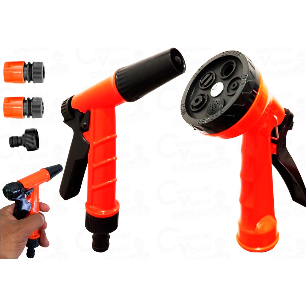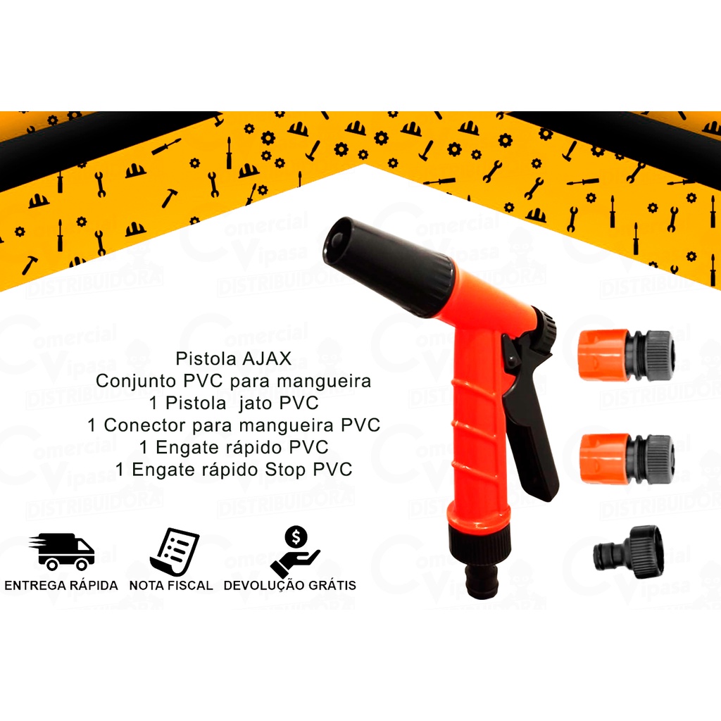COMERCIAL VIPASA DISTRIBUIDORA. Kit Jogo Esguicho para Mangueira Tipo Pistola com Trava Plástica 5 Funções e a Jato 4 Peças - Ajax Escolhendo na Variação Conjunto de Irrigação pode ser usado em seu jardim, horta doméstica e em todos os sistemas de irrigações. Informações Técnicas: - Conjunto 4 Peças PVC para Mangueira - Pistola 5 Funções - Pistola a jato - Possui 1 Pistola PVC - Possui 1 Engate rápido PVC - Possui 1 Engate rápido stop PVC - Possui 1 Conector para Mangueira PVC - Cor: Laranja O Kit Jogo Esguicho para Mangueira Tipo Pistola com Trava Plástica 5 Funções e a Jato 4 Peças é um conjunto de acessórios projetado para facilitar e melhorar a experiência de rega e limpeza ao utilizar uma mangueira de jardim. O kit inclui uma pistola de esguicho com trava plástica e quatro peças que permitem diferentes tipos de jato d'água, oferecendo versatilidade para diversas aplicações. Para que Serve Este kit serve para: Rega de Plantas: Com 5 funções de esguicho diferentes, você pode ajustar o fluxo de água de acordo com as necessidades das suas plantas, desde um spray suave para plantas delicadas até um jato mais forte para arbustos ou árvores. Limpeza de Áreas Externas: A pistola de esguicho com jato forte é ideal para limpar calçadas, muros, pisos, carros e outras superfícies externas, removendo sujeira e detritos com facilidade. Economia de Água: A trava plástica permite que você mantenha o fluxo de água constante sem precisar segurar o gatilho o tempo todo, ajudando a controlar e economizar água durante o uso. Versatilidade de Uso: As cinco funções de esguicho oferecem diferentes padrões de spray, como névoa, jato concentrado, chuveiro, entre outros, permitindo que você escolha a opção mais adequada para cada tarefa. COMERCIAL VIPASA DISTRIBUIDORA.