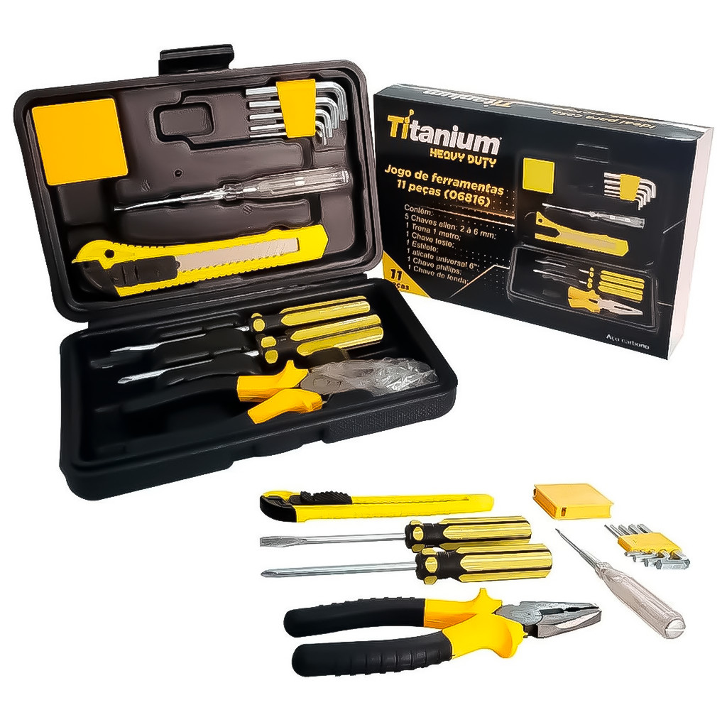COMERCIAL VIPASA DISTRIBUIDORA. Kit Jogo Ferramenta 51 Peças Soquetes Canhão Chave Catraca Reversível Estilete Alicate Fenda Philips Descrição Jogo de soquete sextavado 1/4"e 3/8” com 40 peças é uma ferramenta projetada para tornar o trabalho de aperto e soltura de porcas e parafusos muito mais rápido e leve. Produzida em aço especial e reforçado. São ferramentas que não pode faltar na sua caixa de ferramentas. - Indicada para ajustes, regulagens e apertos - Fabricada em aço especial - Acabamento reforçado - Jogo composto por: :: 14 soquetes sextavados em milímetro 1/4" – 4, 4.5, 5, 5.5, 6, 6.5, 7, 7.5, 8, 9, 10, 11, 12, 13 mm :: 17 soquetes sextavados em polegadas 1/4" – 5/32”, 3/16”, 7/32”, 1/4”, 9/32”, 5/16”, 11/32”, 3/8”, 13/32”, 7/16”, 15/32”, 1/2”, 17/32”, 9/16”, 1/4", 5/16”, 3/8” :: 02 soquetes sextavado em milímetro 3/8” – 14, 15 mm :: 02 soquetes sextavado em polegadas 3/8” – 5/8”, 11/16” :: 01 extensão 3/8”: 3” :: 01 adaptador: 1/4” x 3/8” :: 01 chave catraca: 3/8” :: 01 Estojo organizador :: 01 Disco Jogo de ferramentas 11 peças com maleta - 06816 Peso: 0.70 Kg O Jogo de ferramentas 11 peças com maleta - 06816 da Titanium conta com ferramentas essenciais incríveis e é perfeito para você executar diversos tipos de trabalhos. Com 11 peças variadas, o Jogo de ferramentas 06816 da Titanium é ideal para diversas aplicações diárias, além de ser extremamente útil para trabalhos de hobby. Composto por ferramentas robustas e com alta qualidade. Acompanha maleta plástica que ajuda no transporte e no armazenamento. Especificações Técnicas: Embalagem: 11 peças. Itens Inclusos: Jogo 11 Peças Composição do jogo: 5 Chaves Allen (2 a 6mm) 1 Trena (1m) 1 Chave Teste 1 Estilete 1 Alicate Universal (6) 1 Chave Philips 1 Chave De Fenda. COMERCIAL VIPASA DISTRIBUIDORA.
