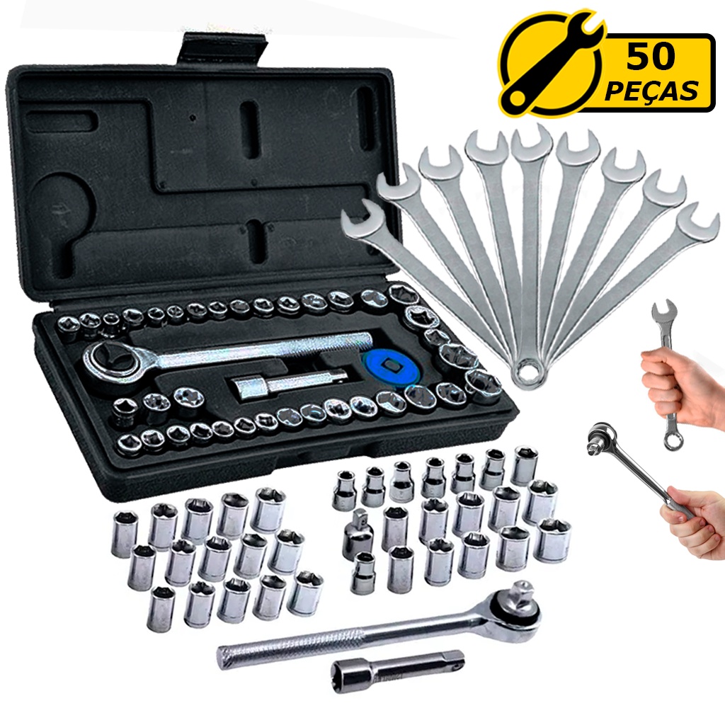 Kit Jogo Ferramentas 50 Peças Com Chave Combinadas Várias Medidas Chave Catraca Reversível Soquetes