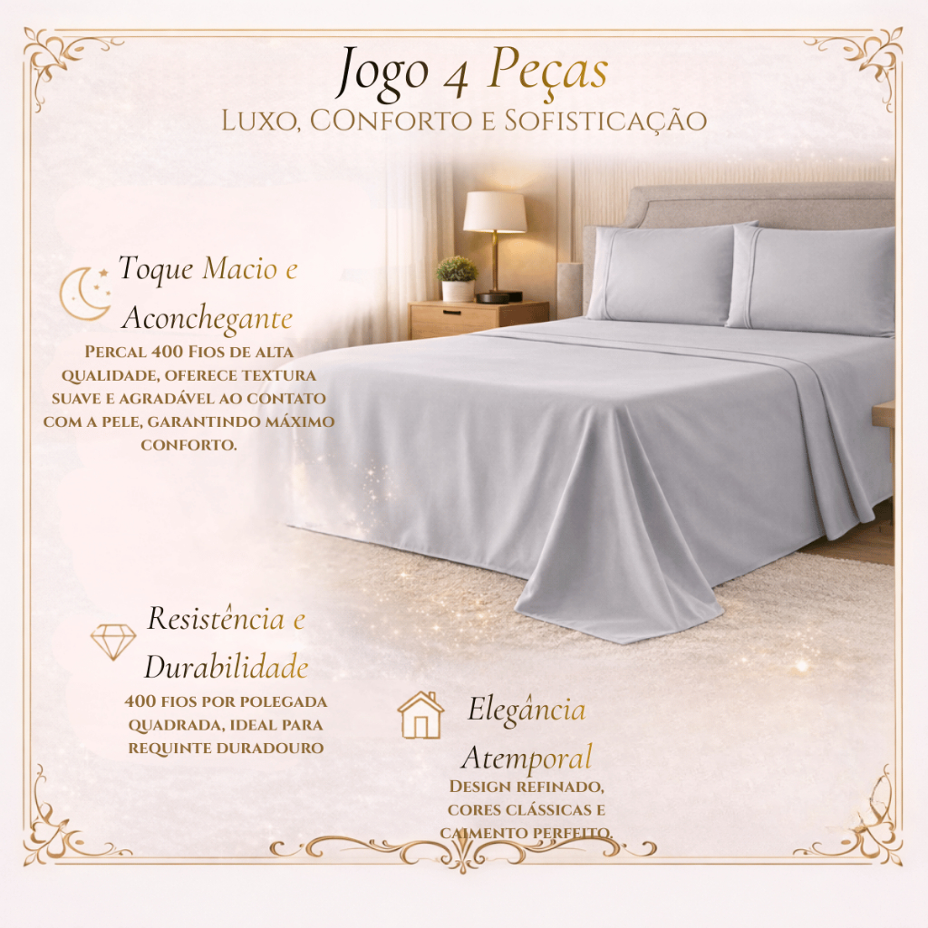 ✨ Jogo de Lençol Casal 4 Peças Ponto Palito – Micropercal 400 Fios | La Vie Enxovais Conforto premium, acabamento clássico e sofisticação atemporal Transforme suas noites de sono em momentos de puro conforto e bem-estar com o Jogo de Lençol Ponto Palito La Vie Enxovais. Produzido em micropercal 400 fios, oferece toque macio, frescor e excelente respirabilidade, garantindo uma experiência de descanso superior. O elegante acabamento em ponto palito adiciona um charme clássico e refinado, valorizando a decoração do quarto com discrição e sofisticação. 🛏️ Conteúdo do Jogo – 4 Peças 01 Lençol de baixo com elástico Medidas: 1,38 m x 1,88 m x 25–30 cm (ideal para colchão casal padrão) 01 Lençol de cima Medidas: 2,20 m x 2,50 m (tamanho amplo para melhor caimento) 02 Fronhas Medidas: 70 cm x 50 cm cada 💎 Diferenciais do Produto Micropercal 400 fios: toque acetinado, suave e confortável Tecido respirável: mais frescor e bem-estar durante o sono Acabamento em ponto palito: elegância clássica e atemporal Lençol com elástico: ajuste perfeito ao colchão Alta durabilidade: mantém a qualidade mesmo após várias lavagens Fácil manutenção: praticidade para o dia a dia 🌙 Ideal para quem busca conforto premium aliado a um design sofisticado, transformando a cama em um verdadeiro refúgio de descanso. ✨ La Vie Enxovais – conforto que se sente, elegância que se vê. 👉 Garanta agora o seu Jogo de Lençol Ponto Palito Micropercal 400 Fios e eleve o padrão do seu quarto.