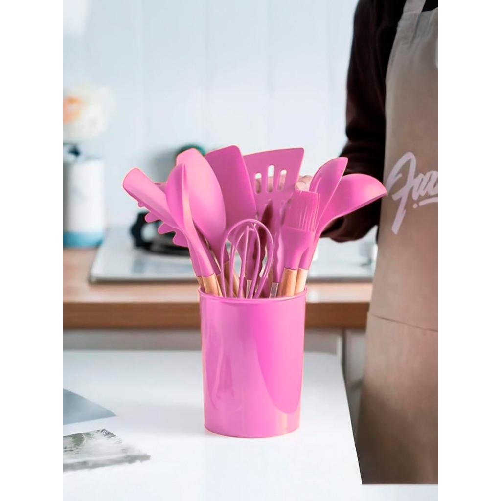 Kit Jogo Utensílios De Cozinha Silicone 12 Peças Cabo Madeira Panelas Antiaderente Cozinha