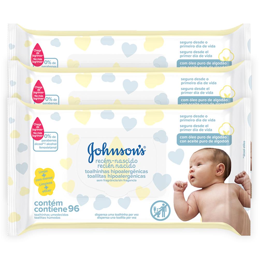 O Kit contém: 3 Toalhas Umedecidas Johnson's Baby Recém-Nascido com 96un cada. As toalhinhas JOHNSON'S® Recém-Nascido foram desenvolvidas para cuidar da pele mais delicada, mesmo após as diversas trocas do dia. Com óleo puro de algodão, limpa suavemente sem deixar resíduos. BENEFÍCIOS: - Foram desenvolvidas para cuidar da pele mais delicada, mesmo após as diversas trocas do dia. - Com óleo puro de algodão, limpa suavemente sem deixar resíduos. - Clinicamente comprovado: tão suave como água pura - Seguro desde o primeiro dia de vida - pH fisiológico e hipoalergênico. Testado por pediatras e dermatologistas MODO DE USO: Abra a tampa adesiva e puxe a primeira toalhinha pelo centro. Após o uso, feche a tampa adesiva para conservar a umidade das toalhinhas.