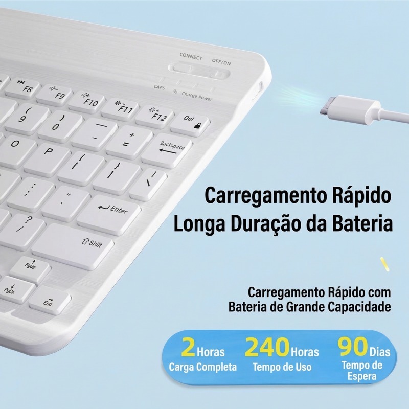 As principais características: Teclado ultra fino e leve: o perfil ultra fino e o peso reduzido, o teclado é muito portátil, tornando-o perfeito para levar em qualquer lugar, seja no escritório, em casa ou em viagens. Ampla conectividade: graças à conectividade bluetooth 3.0, o kit é compatível com vários dispositivos, incluindo tablets, telefones celulares, laptops e PCS. Isso significa que você pode alternar facilmente entre dispositivos sem a necessidade de fios ou adaptadores. Alcance de 10 metros: a conexão bluetooth deste kit oferece um alcance sem barreiras de até 10 metros, dando-lhe a liberdade de usar seu dispositivo convenientemente, mesmo a uma distância considerável. Bateria de longa duração: o design do teclado garante uma bateria de longa duração. Até 100 horas de uso contínuo, você não precisa se preocupar em recarregar com frequência. Quando o carregamento é necessário, o tempo de carregamento é de apenas 4 horas, tornando o kit rapidamente pronto para uso. Teclas de tesoura: o teclado possui teclas de tesoura para fornecer digitação silenciosa, responsiva e confortável. Isso garante uma experiência de digitação eficiente e agradável. O teclado slim bluetooth 3.0 combina praticidade, versatilidade e estilo em um kit compacto. Seja produtividade de trabalho, navegação na internet ou jogos casuais, este kit fornece uma solução completa para suas necessidades de entrada sem fio. Com bateria de longa duração e design elegante, é ideal para quem procura um teclado bluetooth portátil confiável. Padrão internacional: Conteúdo do pacote: 1 teclado sem fio 1 x cabo de carregamento Tamanho do pacote: 6 . 1 * 9 . 5 * 2 .1cm Peso do corpo 170 gramas