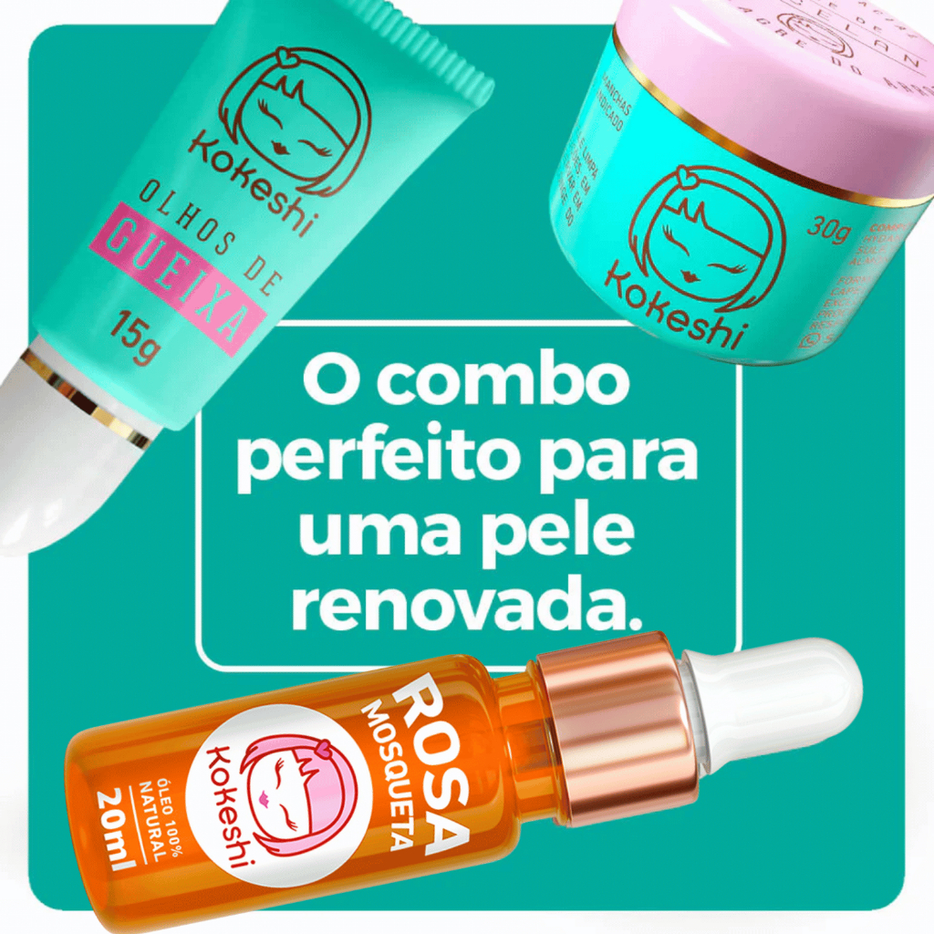 Super Kit Renovadores Faciais + Óleo de Rosa Mosqueta – Kokeshi Cosméticos Se você já amava o poder do Pele de Porcelana e do Olhos de Gueixa, prepare-se para levar sua rotina a outro nível — agora o nosso combo queridinho chega turbinado com o Óleo de Rosa Mosqueta Puro! Inspirada nos rituais asiáticos, a Kokeshi une tradição e inovação para entregar uma pele radiante mesmo no clima brasileiro. Esse kit é perfeito para quem quer hidratação profunda, renovação diária e um toque extra de nutrição 100 % natural. Hidratação que faz diferença: textura leve que some na pele, mas deixa um glow de “acordei assim” MODO DE USAR 1: Manhã e noite: aplique o Pele de Porcelana no rosto limpo. 2: Dê atenção especial à região dos olhos com o Olhos de Gueixa. 3: Finalize com 2 a 3 gotinhas do Óleo de Rosa Mosqueta; massageie até absorver. ATIVOS Óleo do arroz; Farinha do arroz; Óleo de rosa mosqueta; Pantenol; Óleo de amêndoa doce; Chá verde e sálvia; Canina fruit oil / óleo de rosa mosqueta BENEFÍCIOS Pele de Porcelana — Creme Renovador Facial Alto poder hidratante que deixa a pele macia e com toque aveludado Uniformiza o tom e controla o brilho excessivo Suaviza rugas e linhas finas, prevenindo o envelhecimento precoce Equilibra a oleosidade sem ressecar Reduz descamação e vermelhidão, restaurando o conforto da pele Olhos de Gueixa — Creme Renovador para a Área dos Olhos Diminui olheiras e bolsas, iluminando o olhar Melhora a luminosidade e o aspecto cansado Hidratação delicada para a região mais sensível do rosto Suaviza linhas finas ao redor dos olhos Óleo de Rosa Mosqueta Puro (20 ml) Hidratação Profunda com absorção rápida Pureza Inigualável: 100 % Canina fruit oil prensado a frio, sem aditivos Regenera e uniformiza a textura da pele, auxiliando em marcas e cicatrizes Glow natural imediato: potencialize o viço aplicando 2–3 gotinhas no final da rotina PRECAUÇÕES Uso Externo. Mantenha fora do alcance de crianças e ao abrigo da luz e do calor. Em caso de contato com os olhos enxague abundantemente. Não aplique sobre a pele ferida ou irritada. Em caso de sensibilidade suspenda o uso. COMPOSIÇÃO Creme Pele de Porcelana – aqua, panthenol, Rosa canina fruit oil, DMDM hydantoin, fragrance/parfum, cetearyl alcohol / sodium cetearyl sulfate, Oryza sativa (rice) bran oil, Prunus amygdalus dulcis (sweet almond) oil, Oryza sativa powder. Olhos de Gueixa – água/aqua, pantenol, óleo de fruta Rosa canina, DMDM hydantoin, fragrância/parfum, álcool cetearílico / sulfato cetearílico de sódio, óleo de farelo de Oryza sativa (arroz), óleo de Prunus amygdalus dulcis (amêndoa doce), pó de Oryza sativa, Salvia officinalis leaf extract, mel extract, Camellia sinensis leaf extract. * Contém extrato de mel; não é um produto vegano. Renovação sem agredir: ativos inteligentes que suavizam sem irritar. Rosa Mosqueta Pura: óleo prensado a frio, rico em ácidos graxos essenciais e vitaminas que regeneram e uniformizam o tom da pele. Óleo de Rosa Mosqueta: Canina fruit oil / óleo de rosa mosqueta.