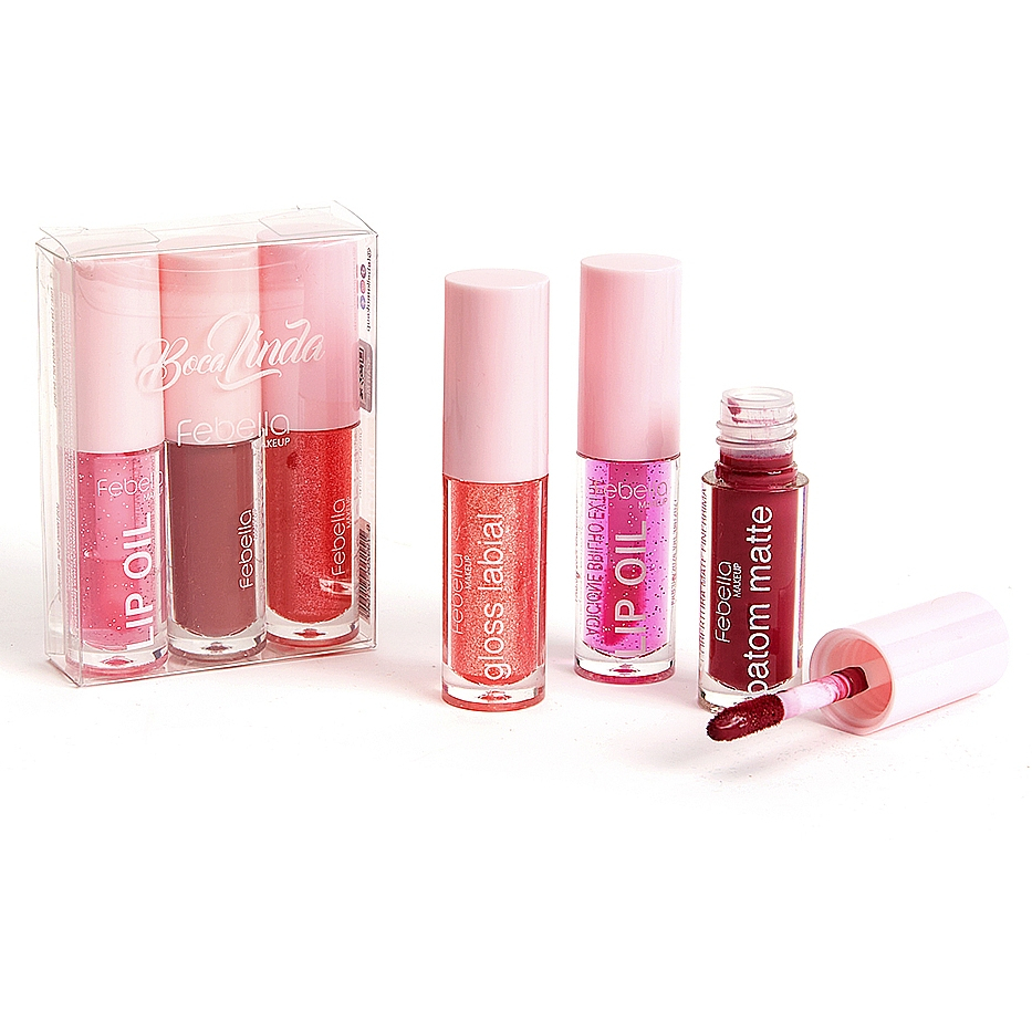 Kit Labial Lip oil Febella, Lábios hidratados, macios e com cores vibrantes, Caixinha com 3 Itens