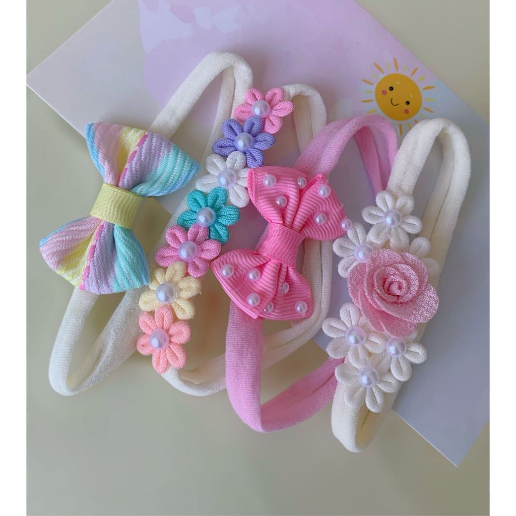 Kit com 4 Faixinhas Coloridas, Delicadas e Divertidas. Faixinha de Meia de seda super macia não aperta e não incomoda a cabecinha da Bebê Laçinhos Indicados para bebês Recém Nascidas até 2 anos aproximado * As cores não podem ser alteradas