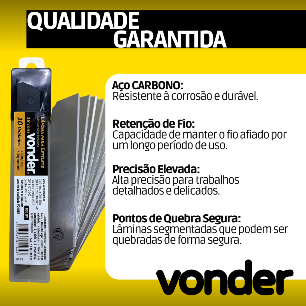 ENVIO IMEDIATO!!! LÂMINAS VONDER - 18 MILÍMETROS ------> As lâminas VONDER de 18 milímetros são a escolha perfeita para profissionais que buscam precisão e durabilidade em seus trabalhos. Disponíveis em kits completos, estas lâminas atendem a todas as suas necessidades profissionais, garantindo cortes limpos e eficazes em qualquer situação. CARACTERÍSTICAS DAS LÂMINAS: Alta Qualidade e Durabilidade: ✅ Aço Carbono: Resistente à corrosão e durável, oferecendo uma combinação ideal de dureza e flexibilidade. ✅ Retenção de Fio: As lâminas mantêm o fio afiado por longos períodos, garantindo eficiência em usos contínuos. Precisão Elevada: ✅ Trabalhos Detalhados: Alta precisão para cortes delicados e detalhados, essenciais em projetos profissionais. Segurança e Versatilidade: ✅ Pontos de Quebra Segura: Lâminas segmentadas que podem ser quebradas de forma segura para um uso contínuo e eficaz. ✅ Diversas Opções de Tamanho: Disponíveis em kits variados que vão de 10 até 100 lâminas para atender a todas as demandas. 4. Proteção e Eficiência: ✅ Óleo Protetor: O óleo na lâmina evita que a cola, como a de fita adesiva, prejudique o uso futuro, garantindo sempre um corte limpo. ✅ Corte Limpo: As lâminas VONDER garantem cortes precisos e sem imperfeições, aumentando a qualidade do seu trabalho. KITS DISPONÍVEIS: ✅ Pacotes com 10 , 20, 30, 40, 50, 80 e 100 lâminas. 🛑O ANÚNCIO TEM 7 OPÇÕES DE COMPRA, ATENTE-SE PARA QUE NÃO HAJAM MAL ENTENDIDOS. GARANTA JÁ O SEU! 🛍️ ------------------------------------------------------------- DÚVIDAS? ESTAMOS AQUI PARA AJUDAR! ❓ > Em caso de dúvidas, utilize o campo de perguntas. Garantimos pronta entrega e postagem de segunda a sexta-feira, dentro de 24h após a confirmação do pagamento. IMPORTANTE: SUA SATISFAÇÃO GARANTIDA! ✔️ > A entrega é assegurada pela Shopee. Oferecemos uma garantia de 7 dias contra defeitos de fabricação. VONDER: Qualidade e Precisão para Profissionais Exigentes.