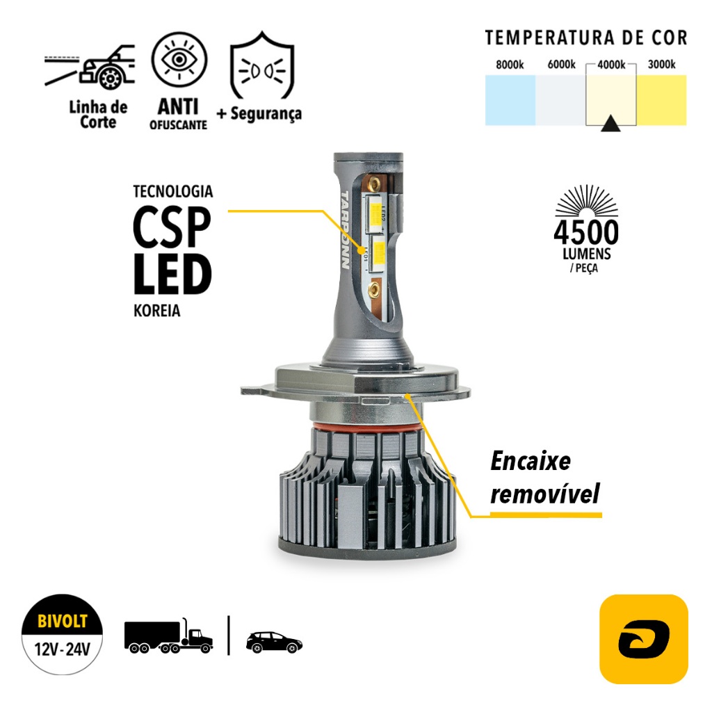 PRODUTO A PRONTA ENTREGA, COM ENVIO IMEDIATO E NOTA FISCAL! CARACTERÍSTICAS: Tecnologia LED CSP Fácil Instalação Mais Compacto Peça 20% menor Dupla Refrigeração Corpo em alumínio de aviação Driver Incorporado 4000k Iluminação branca neutra APLICAÇÃO: Farol alto e baixo. FICHA TÉCNICA: Temperatura de cor: 4000K Potência: 40W Tensão: 12 V Fluxo luminoso: 4200 lumens/peça Todo acabamento em alumínio de aviação Dissipador de Calor Duplo: Cooler e Alumínio de aviação Encaixe: H4 Temperatura de Trabalho: -40° ~+80°C Grau de proteção: IP 65 Resistência: Vibrações e ao calor Linha de Corte (+ Segurança) Garantia: 1 ano Linha: PREMIUM CONTEÚDO EMBALAGEM: 1 PAR de Lâmpadas Mega GT - Especialista em Acessórios Automotivos e Utilidades Na Mega GT, somos especialistas em Acessórios Automotivos e Utilidades. Buscamos sempre oferecer a melhor opção com preço justo em todas as suas compras. Todos os produtos: • São Produtos Originais • Acompanham Nota Fiscal • Envio em Até 24 Horas • 1 Ano de Garantia DÚVIDAS FREQUENTES: • Os produtos são originais? Sim, todos os nossos produtos são originais e de alta qualidade. • Temos pronta entrega? Sim, todos os nossos produtos estão disponíveis em estoque para envio imediato. Despachamos em até 24 horas. • Emitem nota fiscal? Sim, todos os nossos produtos acompanham nota fiscal, garantindo a sua segurança e a conformidade nas transações comerciais. • Possui garantia? Sim, O produto em anúncio possui 1 Ano de Garantia. A sua satisfação é a nossa prioridade. *Imagens meramente ilustrativas