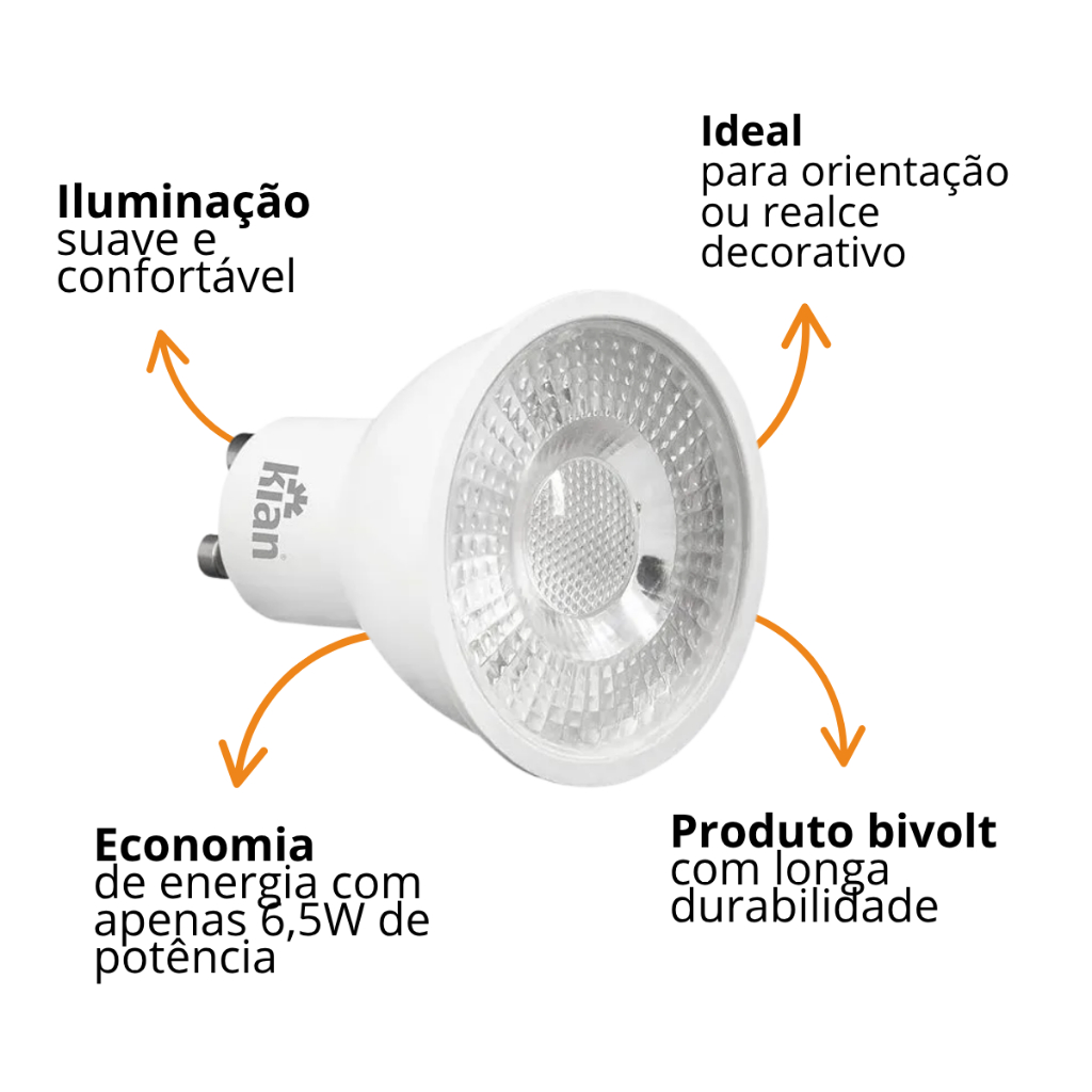 Kit Lâmpadas LED Dicroica MR16 GU10 6,5W Bivolt Kian - Luz Forte Econômica e Durável