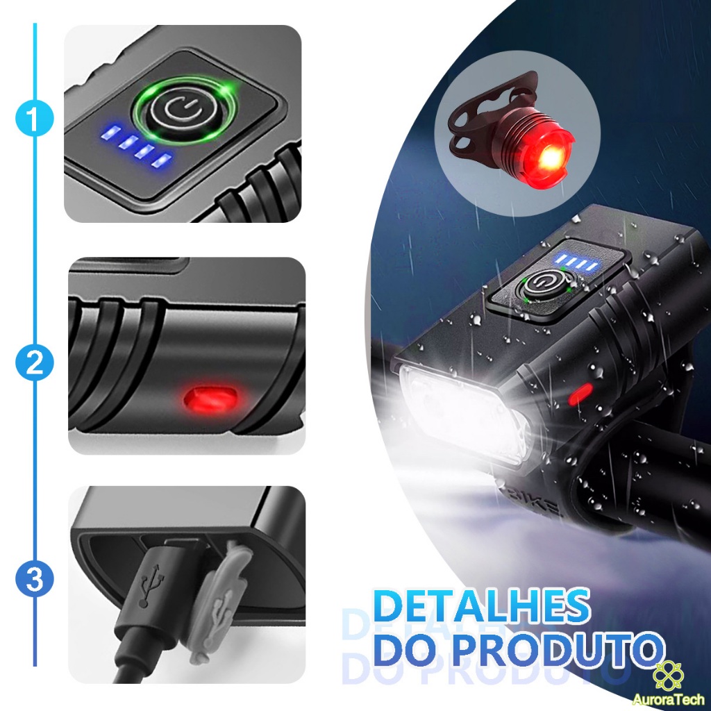Kit Lanterna E Farol Bicicleta 2 Em1 Bik Urbana 6 Modos 10 Horas 2 LED à Prova D'água Recarregável