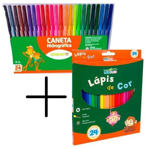 kit Lápis de Cor 24 cores e Caneta Hidrográfica 24 cores Canetinha Leo e Leo