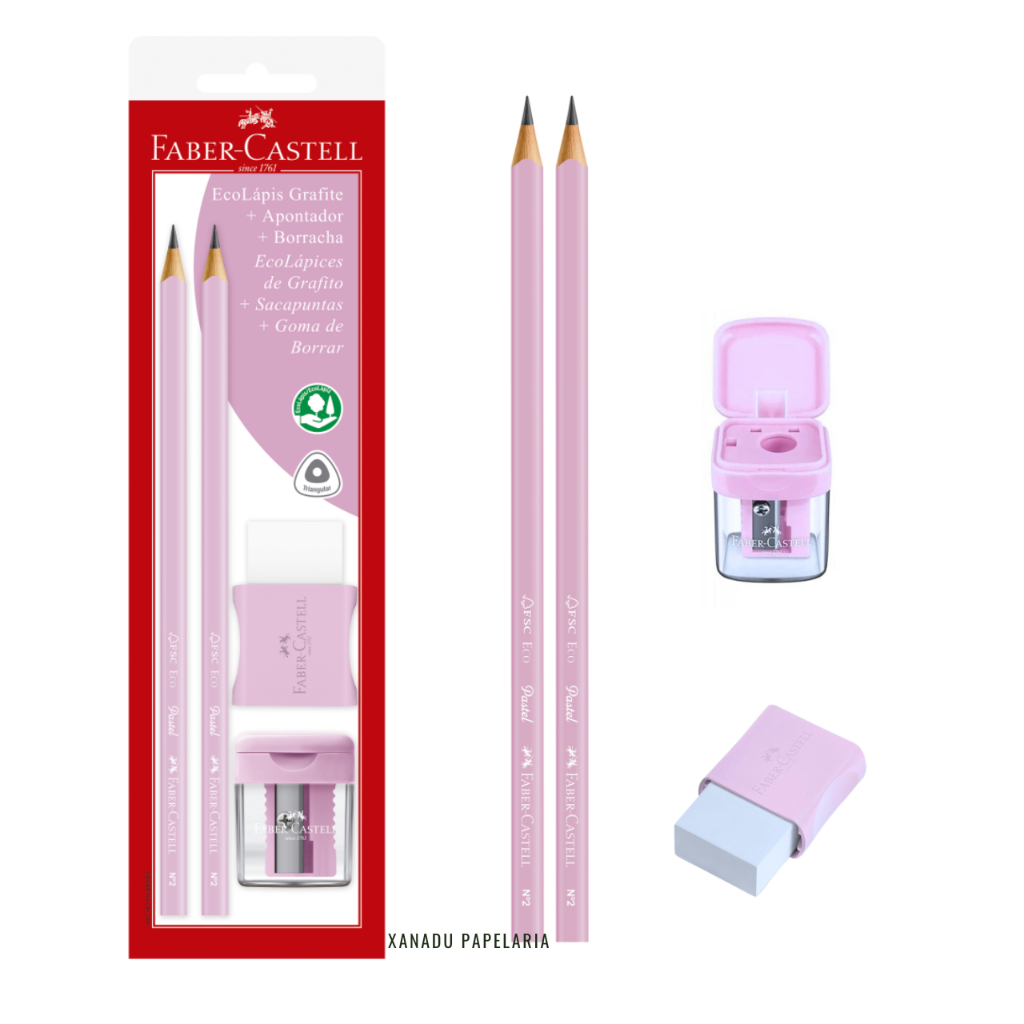 Kit Lápis Grafite Rosa ou Verde-Água Pastel EcoLápis 2B+ Apontador + Borracha Faber-Castell ORIGINAL