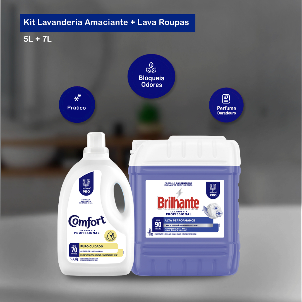 Kit Lava Roupas Alta Performance 7L Brilhante + Amaciante Puro Cuidado 5L Comfort Lava Roupas Líquido Alta Performance 7L Brilhante O Sabão Líquido Brilhante Lavanderia Profissional é o produto perfeito para quem busca qualidade e eficiência na hora de lavar roupas. Sua fórmula possui alto poder de limpeza, removendo as mais difíceis manchas e sujeiras, sem agregar as fibras dos tecidos. Indicação de Uso: - Ideal para quem precisa lavar grandes peças de roupa, seja em casa ou em ambientes profissionais como lavanderias, hotéis e hospitais. Embalagem: 01 galão de 7L Amaciante Puro Cuidado 5L Comfort Indicado para o uso profissional, possui um alto rendimento e ainda perfuma as suas roupas deixando-as fáceis de passar. Sua formulação permite penetrar facilmente nas fibras dos tecidos proporcionando um toque muito especial nas suas roupas. Hipoalergênico rende 500kg de roupas macias e perfumadas. Fragrância: Puro cuidado Embalagem: 01 galão de 5L