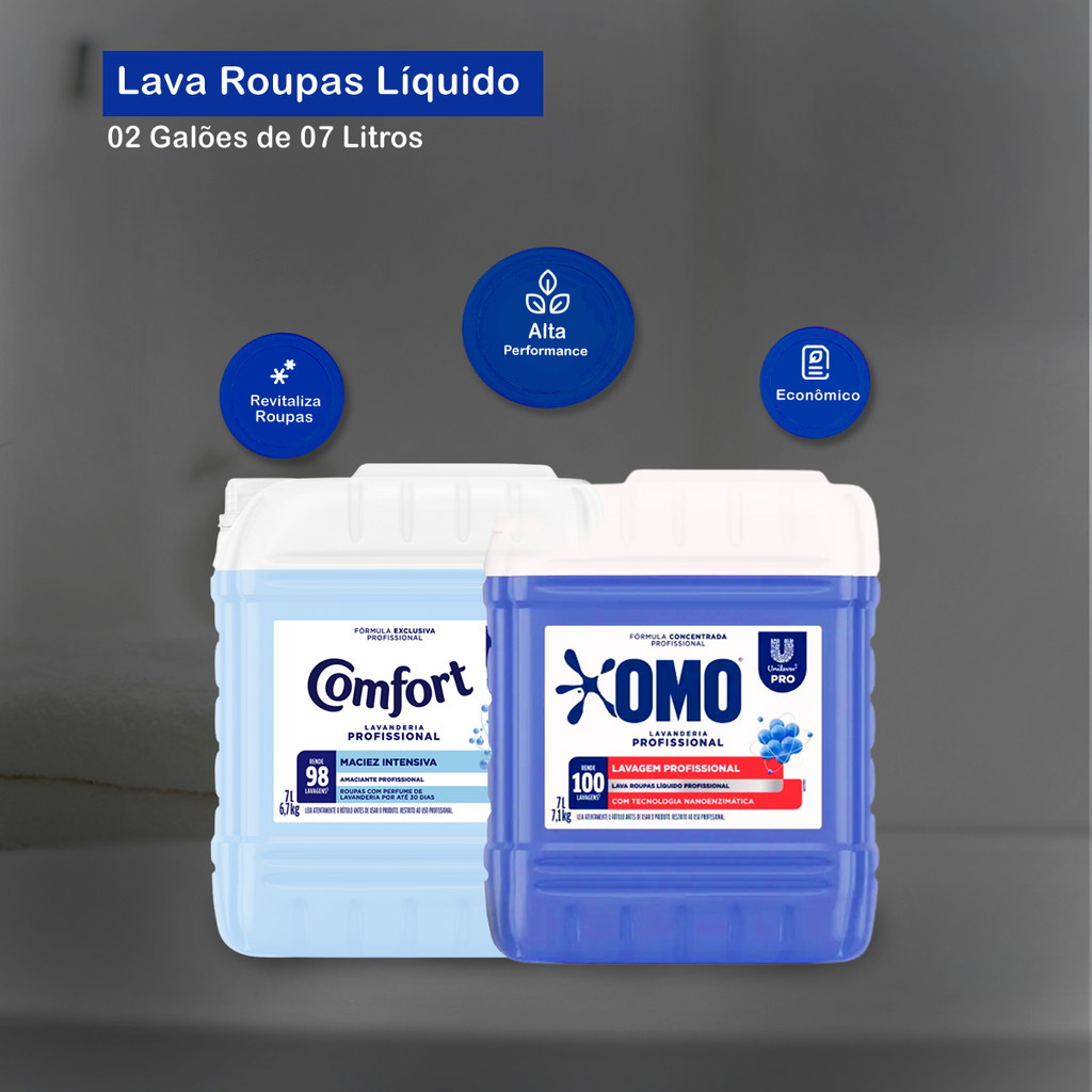 Kit Lavandeira: Lava Roupas Líquido Lavanderia Pro Omo 7L + Amaciante Lavanderia Pro Comfort 7L Lava Roupas Líquido Lavanderia Pro Omo 7L OMO Lavanderia Pro Líquido Lavagem Perfeita oferece a mais avançada tecnologia de compactação em lava-roupas, que permite o tratamento do mesmo número de peças consumindo menos produto. Com um poder de limpeza para roupas delicadas e pesadas, cuida das cores da roupa e remove as manchas na primeira lavagem. É um produto mais sustentável e atinge um alto rendimento: OMO Lavagem Perfeita 7L rende 500kg de roupas limpas! Cor: Azul Fragrância: Característica Embalagem: 01 galão de 7L Amaciante Lavanderia Pro Comfort 7L A fórmula de Comfort Amaciante Classic da linha Profissional foi desenvolvida para garantir a mesma maciez e o mesmo perfume que você já conhece para suas roupas e tecidos. Seu diferencial está na sua fabricação com ingrediente ativo biodegradável. Penetra facilmente nas fibras e tem o tratamento intensivo para as roupas. Perfeita combinação de maciez e perfume que dura muito tempo e ainda com ato nível de ingredientes suavizantes. Mantenha as cores vibrantes dos tecidos como se fossem novos! Cor: Azul Fragrância: Característica Embalagem: 01 galão de 7L