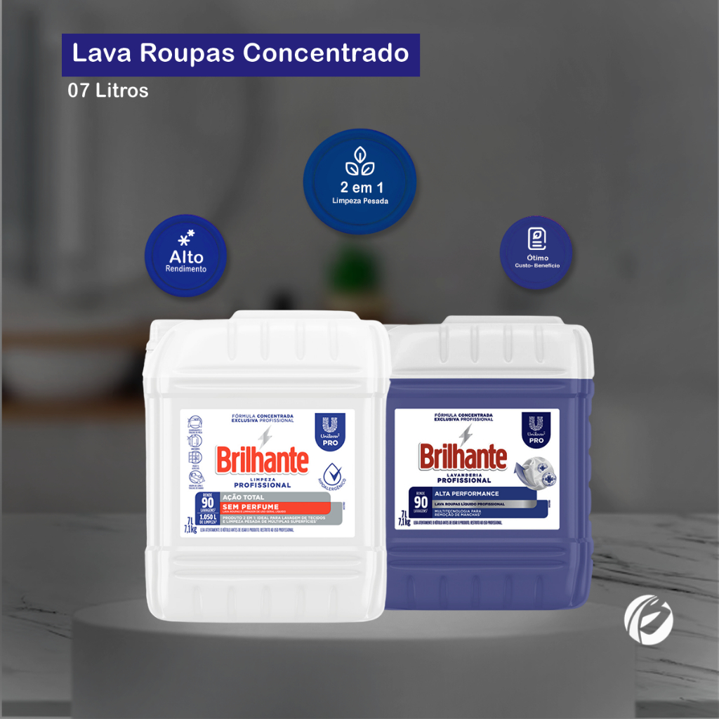Kit Lava Roupas Líquido Alta Performance Brilhante 7L + Bilhante Ação S/ Perfume 7L O Sabão Líquido Brilhante Lavanderia Profissional é o produto perfeito para quem busca qualidade e eficiência na hora de lavar roupas. Com sua fórmula exclusiva, desenvolvida especialmente para uso profissional, ele garante resultados positivos, deixando suas roupas limpas, macias e perfumadas. Com capacidade para 7 litros, o Sabão Líquido Alta Performance Pro é a opção ideal para quem precisa lavar grandes peças de roupa, seja em casa ou em ambientes profissionais como lavanderias, hotéis e hospitais. O perfume suave e duradouro é mais um diferencial deste produto, deixando suas roupas com um aroma agradável e refrescante, além de oferecer uma sensação de roupa limpa por muito mais tempo. Embalagem: 01 galão de 7L cada Lava Roupas Líquido Ação Total Sem Perfume 7L Brilhante Brilhante Limpeza Total Rendimento imbatível: 7L rende 500 kg de roupas limpas. Sem perfume e hipoalergênico ¿ não causa irritações à pele. Ideal para uso em serviços de alimentação, como bares e restaurantes.Limpa tecidos e superfícies, como pisos e azulejos. Detergente líquido concentrado de alto desempenho. Embalagem: 01 galão de 7L