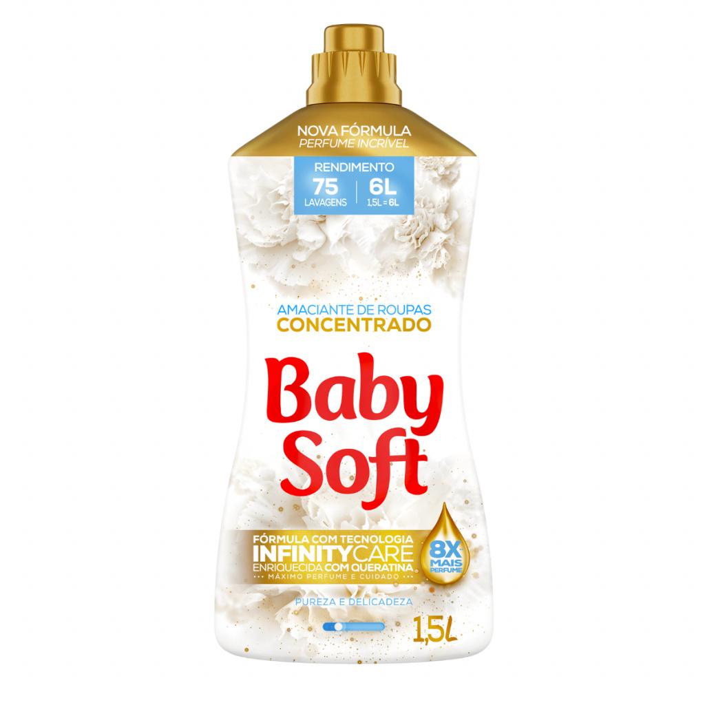 Kit: 1 unidade Lava Roupas Max Cuidado 3L 1 unidade Amaciante Concentrado Baby Soft Pureza e Delicadeza 1,5L Descrição Média Qualidade e carinho para o tratamento das suas roupas! O Lava Roupas Líquido Baby Soft com Fórmula Max Performance foi desenvolvido especialmente para lavagem diária de todas as roupas. Sua fórmula líquida dissolve facilmente, não deixando resíduos nas roupas e permitindo fácil penetração entre as fibras. Rende 36 lavagens. O Amaciante Concentrado, além de todo seu poder, conta com uma formulação especial com cápsulas de perfume que são ativadas durante a lavagem, para que o seu efeito seja prolongado e o perfume dure por mais tempo. Produto hipoalergênico. O Amaciante Concentrado Pureza e Delicadeza foi pensado para quem quer maciez e suavidade, mas não abre mão de um perfume marcante e duradouro nas roupas. Com fórmula dermatologicamente testada e hipoalergênica, proporciona cuidado com você e suas roupas. Além do cuidado com você e sua família, também fazemos questão de não testar nossos produtos em animais. Kit: 1 unidade Lava Roupas Max Cuidado 3L 1 unidade Amaciante Concentrado Baby Soft Pureza e Delicadeza 1,5L