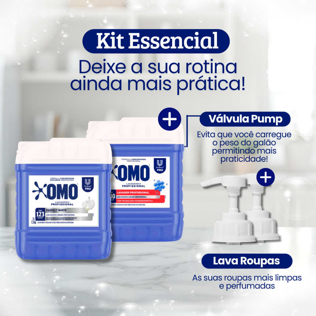Kit Lava Roupas Líquido Perfect White 7L Omo + Lava Roupas Concentrado Lavanderia Pro Líquido 7L Omo + 02 Válvulas Pump para Galão 5L/7L Lava Roupas Líquido Perfect White 7L Omo O OMO Roupa Branca pode ser usado para revitalizar roupas, lençóis, toalhas, cobertores, uniformes, entre muitos outros tecidos. Além disso, ele foi desenvolvido principalmente para atender a necessidade de lavanderias profissionais e comerciais. Lava Roupas Concentrado Lavanderia Pro Líquido 7L Omo OMO Lavanderia Pro Líquido oferece a mais avançada tecnologia de compactação em lava-roupas, que permite o tratamento do mesmo número de peças consumindo menos produto. Ele revitaliza roupas, lençóis, toalhas, cobertores, uniformes, entre muitos outros tecidos. Válvula Pump para Galão 5L/7L Oferece alta vazão profissional, com dosagem entre 4 e 5ml por acionamento, quantidade ideal para dispensar produtos como álcool gel, shampoos, cremes ou sabão líquido de forma eficiente e sem desperdício. Embalagem: 01 Galão de Lava Roupas Líquido Perfect White 7L Omo + Lava Roupas Concentrado Lavanderia Pro Líquido 7L Omo + 02 Unidades Válvulas Pump para Galão 5L/7L