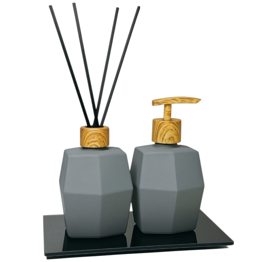 Kit Lavabo Banheiro Cinza Porta Sabonete e Aromatizador Com Bandeja Luxo