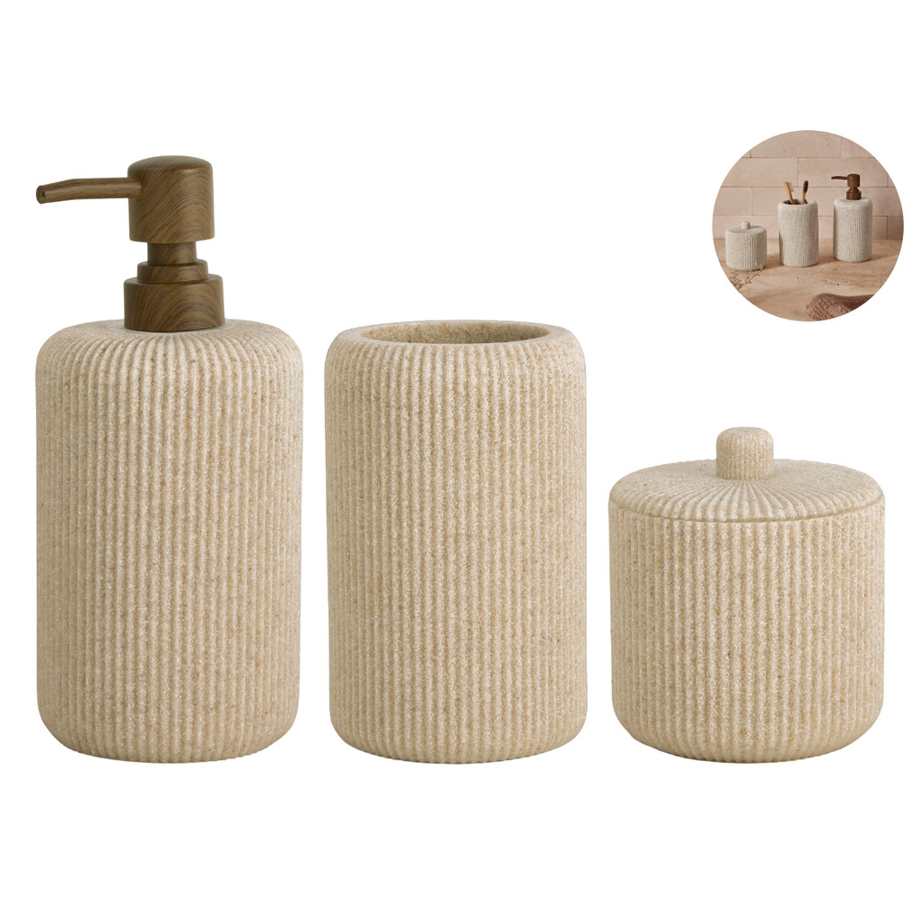 Kit Lavabo Banheiro Poliresina Bege Decorativo Dispenser Sabonete Copo Escovas Pote Canelado Arenoso