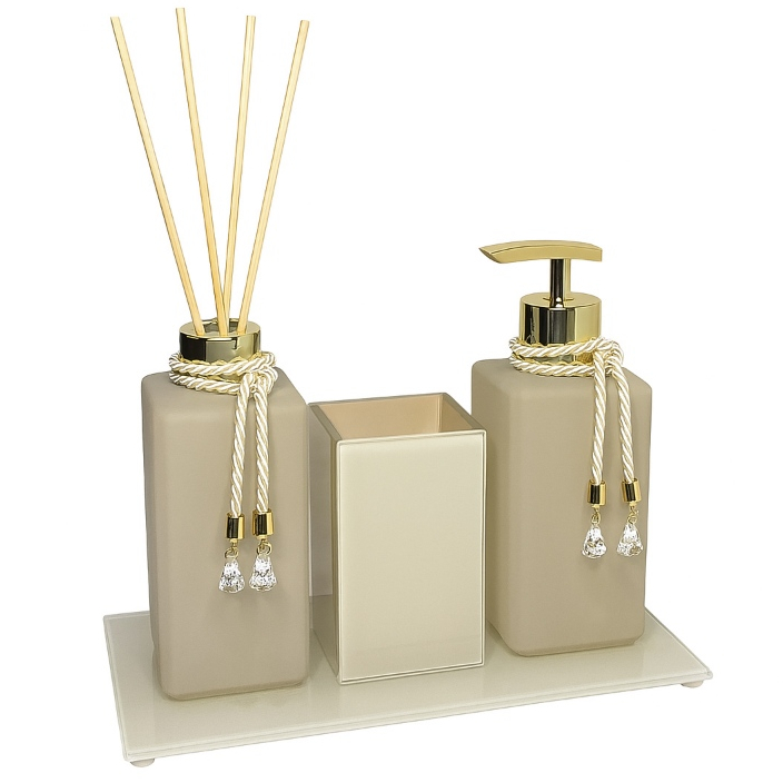 Kit Lavabo Bege Sabonete Líquido C/ Porta Escovas Aromatizador de Ambiente Com Bandeja Luxo