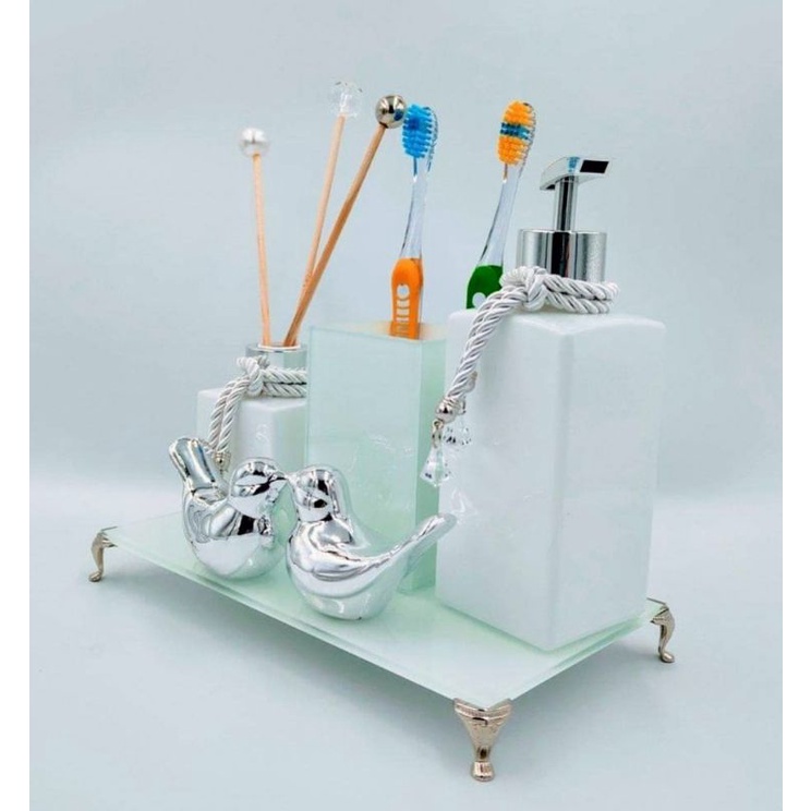 Kit Lavabo Branco/Prata Luxo, Difusor de Ambiente, Saboneteira, Bandeja Espelhada 22 x 12 cm, 2 Passarinhos, Porta Escova Vidro