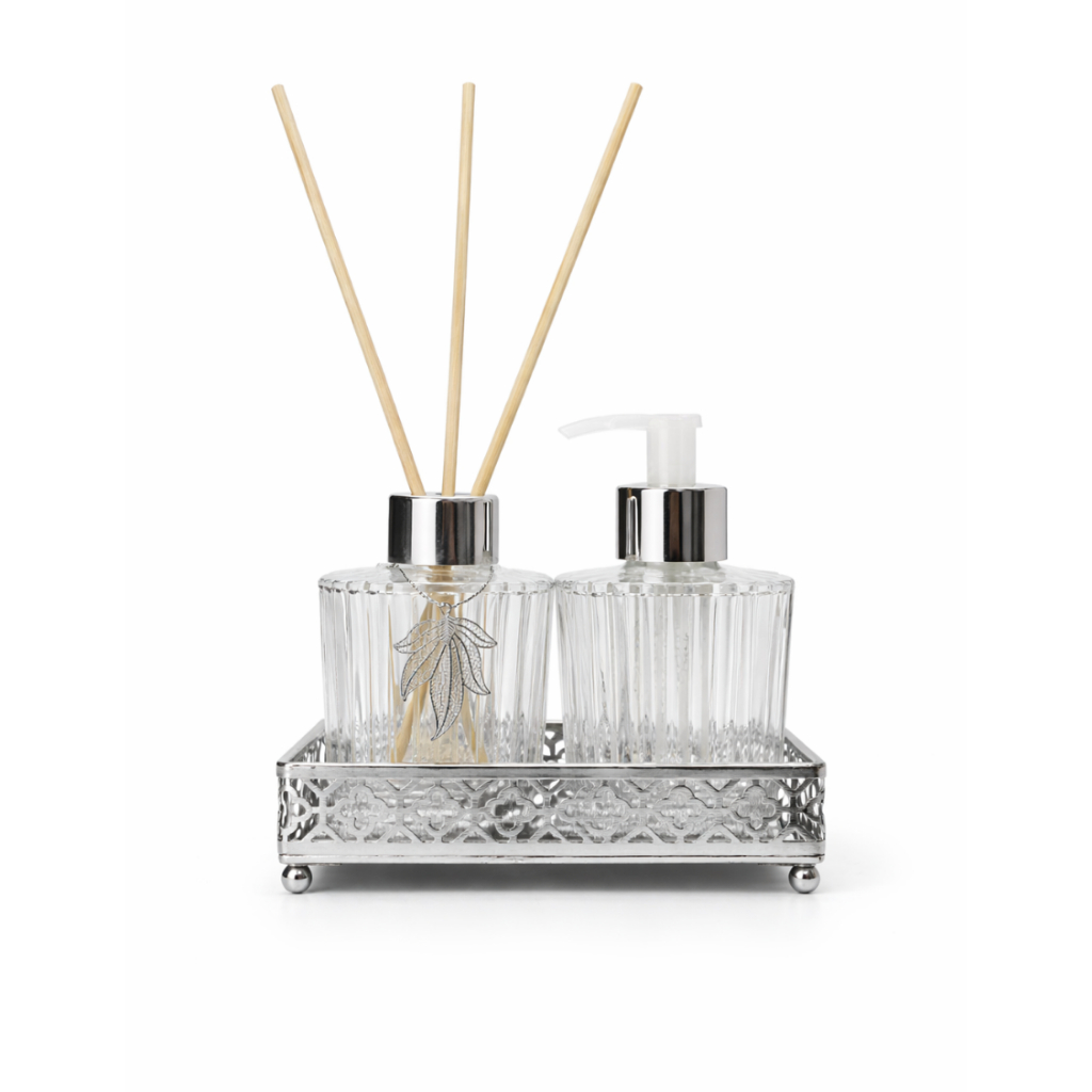 Kit Lavabo Completo Luxo Banheiro Vidro Difusor + Saboneteira 120ml com Bandeja Metal