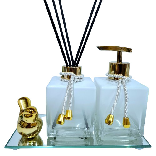Kit Lavabo Cubo branco + acessórios. 01 bandeja Espelhada 10*20 cm, 4 mm de espessura. 01 Enfeite decorativo (Pássarinho) 02 Cordões decorativos. 01 Saboneteira Para Sabonetes Líquidos 250 ml 01 Difusor Para Essências 250 ml. 05 Varetas de fibra. Marca: R&A. *** NÃO ACOMPANHA ESSÊNCIA.