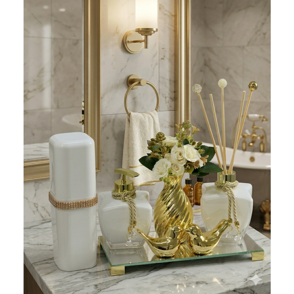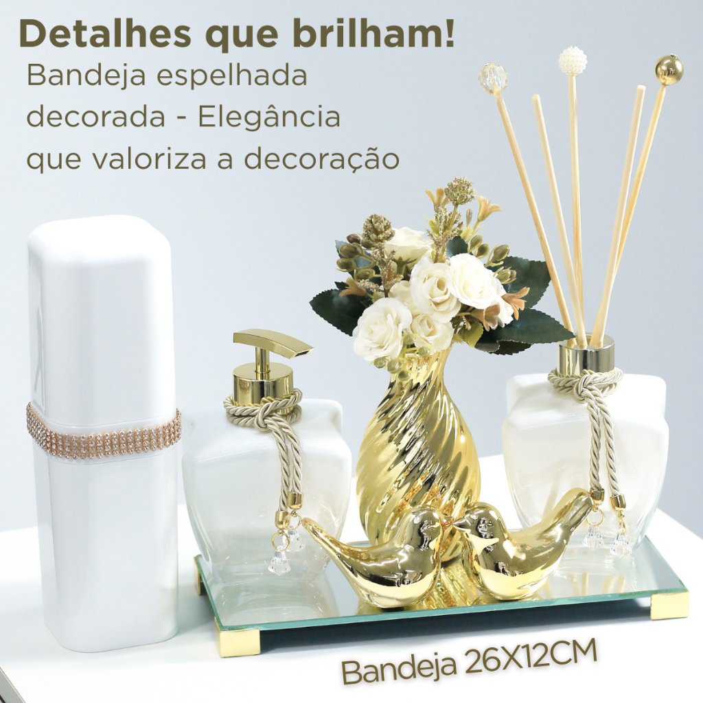 Kit Lavabo Dourado + Bandeja Luxo+ Difusor + Saboneteira + Enfeite Porcelana + Vaso Decorativo + Porta Escovas + Varetas