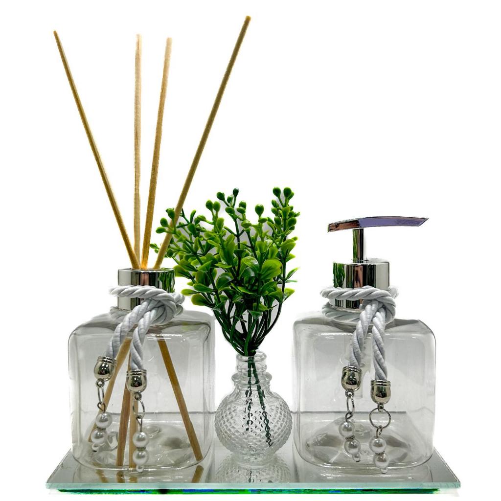 Kit Lavabo Frascos Turmalina Branco PET (Plástico) Para Difusor Sabonete Álcool